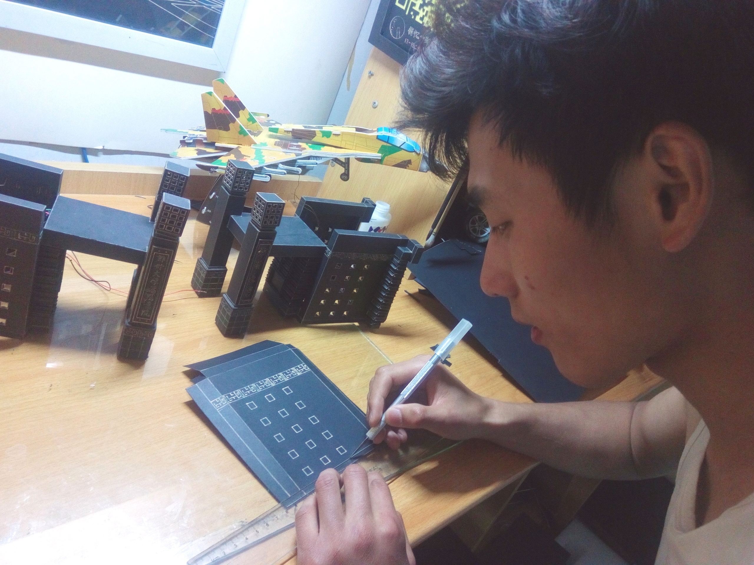 暑假期間,尹燕明耐著近40度的高溫,坐在書桌前小心翼翼地起型、裁剪、溝槽、調(diào)整、粘連,力爭把每一處細節(jié)做到完美。為了防止手心里的汗?jié)n滲透紙張,他想辦法借助各種工具代替手指操作,豆大的汗珠順著額頭流進眼里,不一會的功夫,衣服就濕透了。寒假時,尹燕明將未完成的作品帶回了山東老家。山東的冬天陰冷潮濕,為了不讓手指凍僵,他用電暖器取暖,因過于專注,腿不小心被燙傷,幾塊傷痕至今未消。