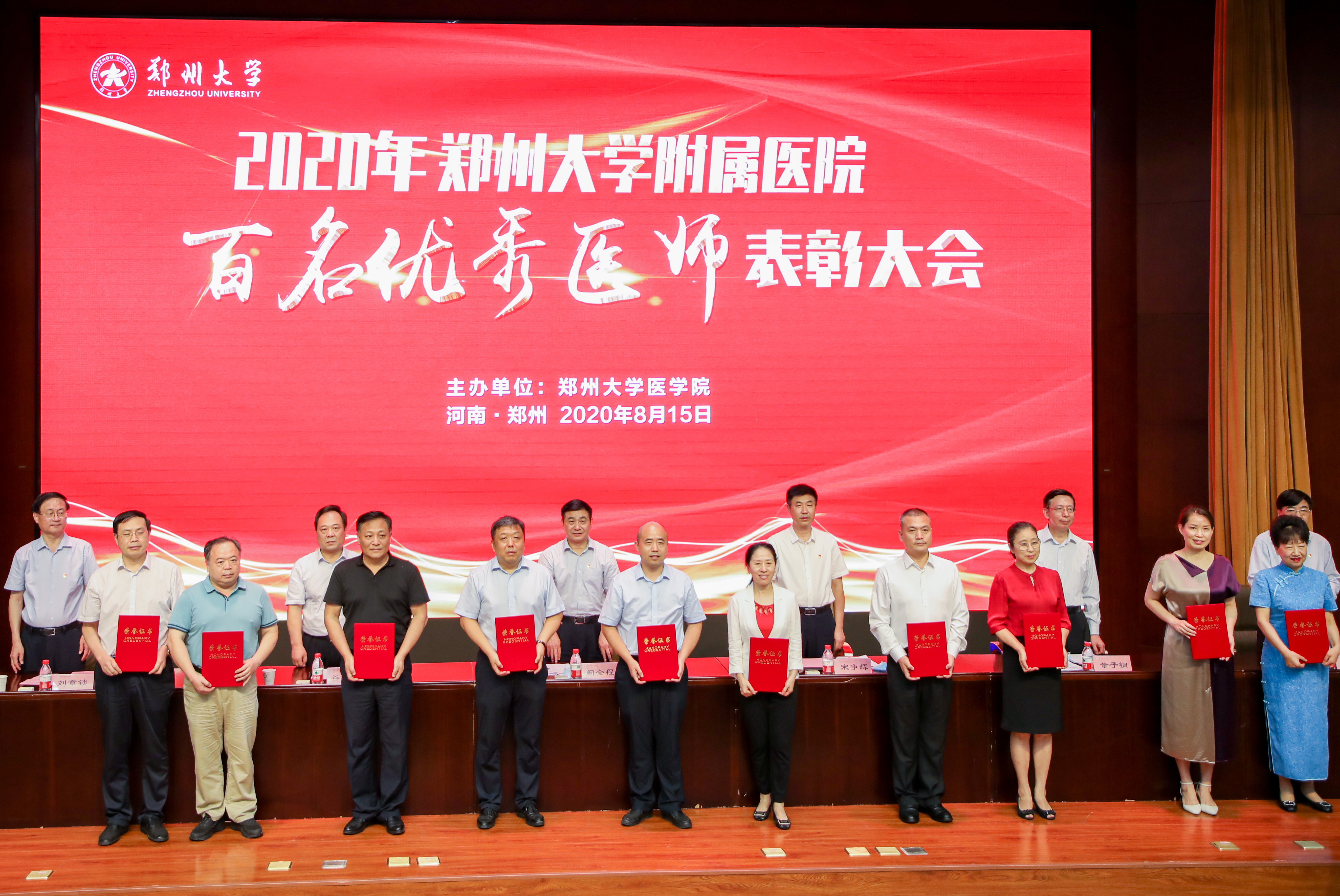 8月15日下午,鄭州大學召開2020年附屬醫院“百名優秀醫師”表彰大會,慶祝第三個“中國醫師節”。河南省衛生健康委黨組書記、主任闞全程,鄭州大學黨委書記宋爭輝,黨委副書記、醫學院黨工委書記谷振清,副校長、醫學院院長董子鋼,醫學院副院長、第一附屬醫院院長劉章鎖,鄭州大學人民醫院院長邵鳳民,省衛健委辦公室、鄭州大學黨辦、校辦等職能部門和醫學院所屬單位、附屬醫院的負責同志,優秀醫師代表等160余人參加表彰大會。表彰會由劉章鎖主持。