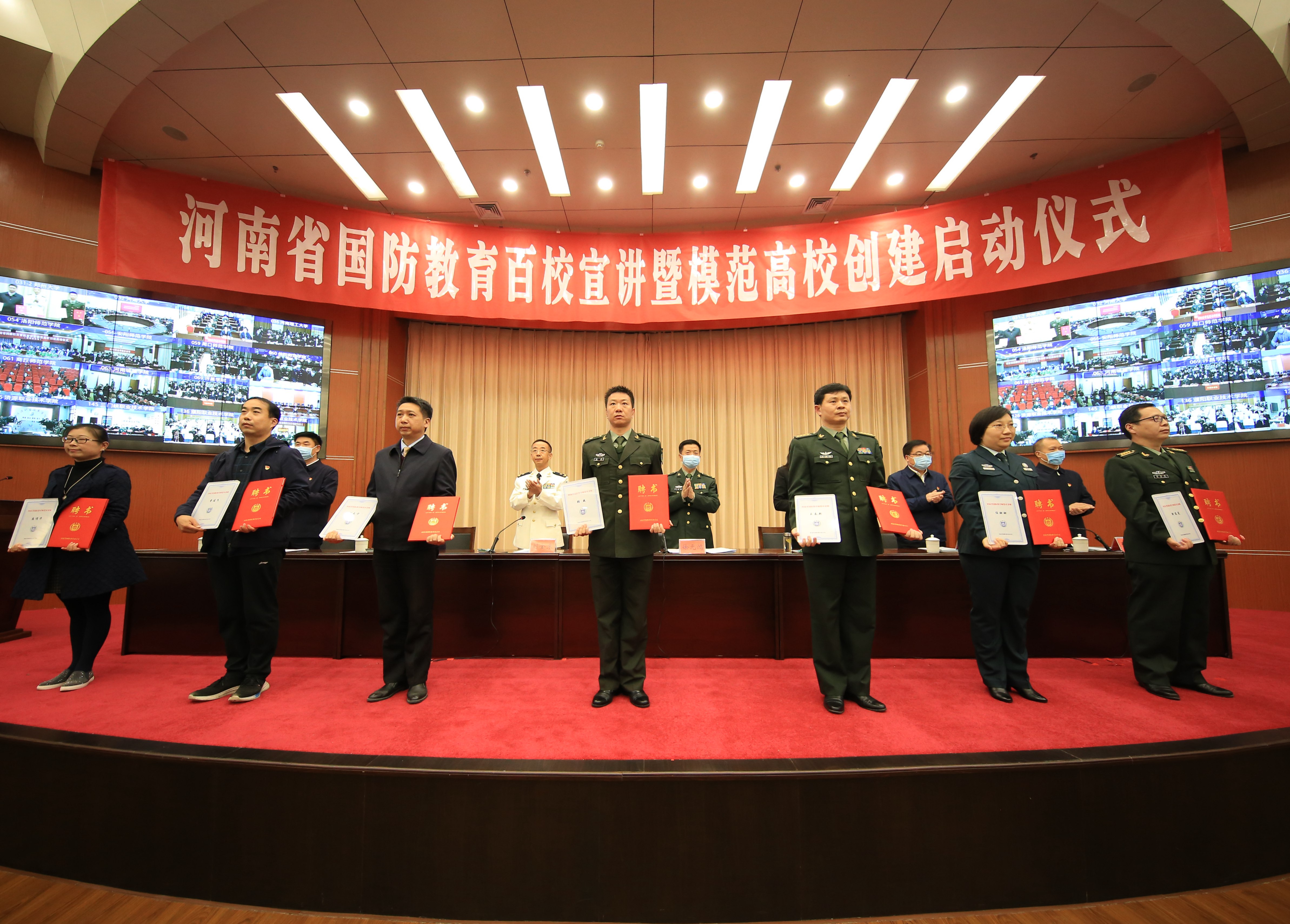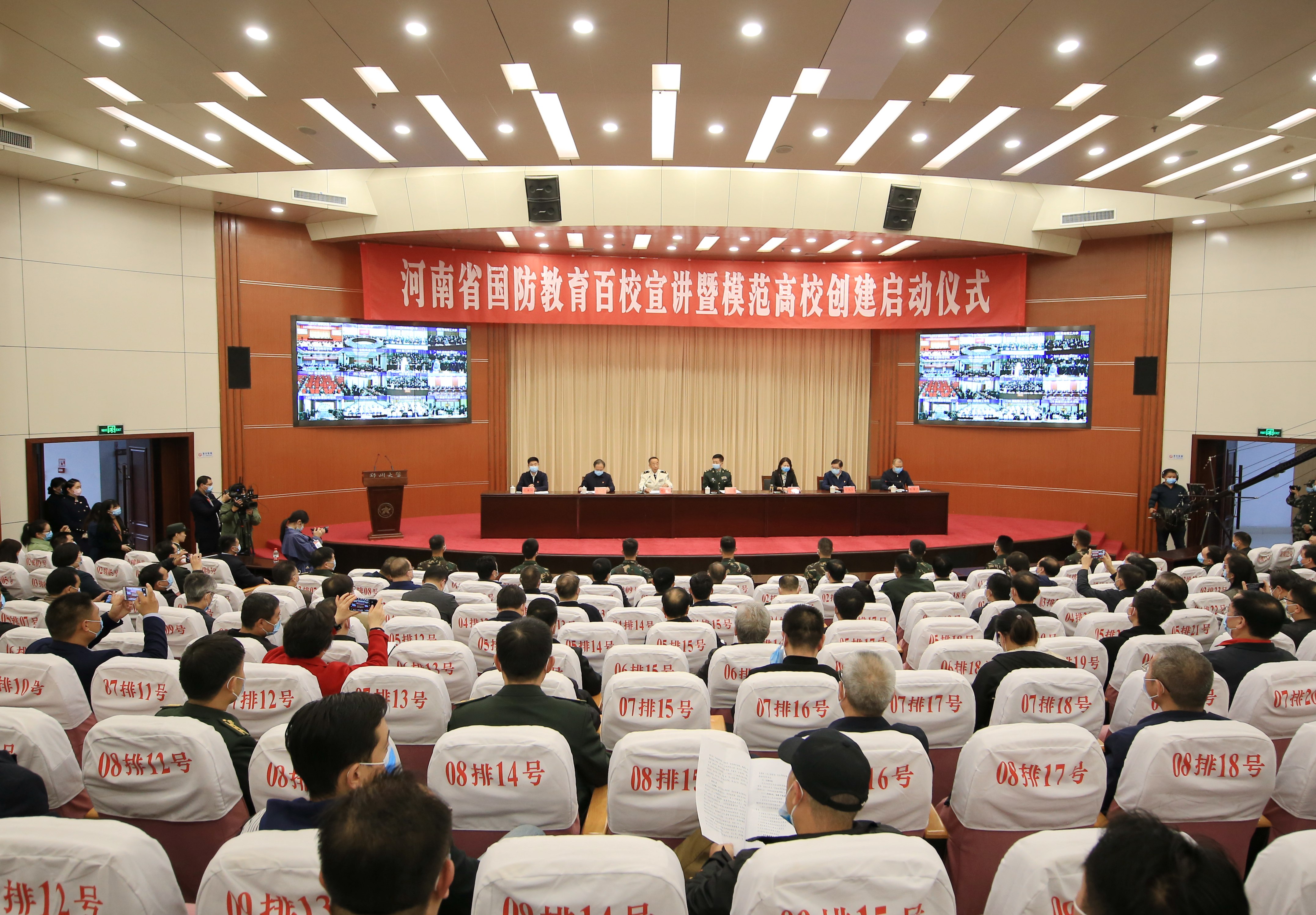 為扎實做好全省普通高等學校國防教育、兵員征集和學生軍訓工作,營造關心支持國防建設的濃厚氛圍。10月15日下午,河南省國防教育百校宣講暨模范高校創建啟動儀式在鄭州大學舉行。河南省軍區政委徐元鴻、副省長霍金花、省委組織部副部長郭成全、省委宣傳部副部長李文良、省教育廳副廳長張傳廣、鄭州大學黨委書記宋爭輝、黨委副書記李興成出席,部分省直機關、省軍區相關部門、鄭州市及駐鄭高校相關負責人,省國防教育師資庫講師代表,國防教育學生志愿者代表參加活動。啟動儀式通過視頻會議形式,在全省17個省轄市同步進行,超過70萬人次在線觀看了此次啟動儀式的線上直播。儀式由省軍區副政委兼紀委書記劉金來主持。