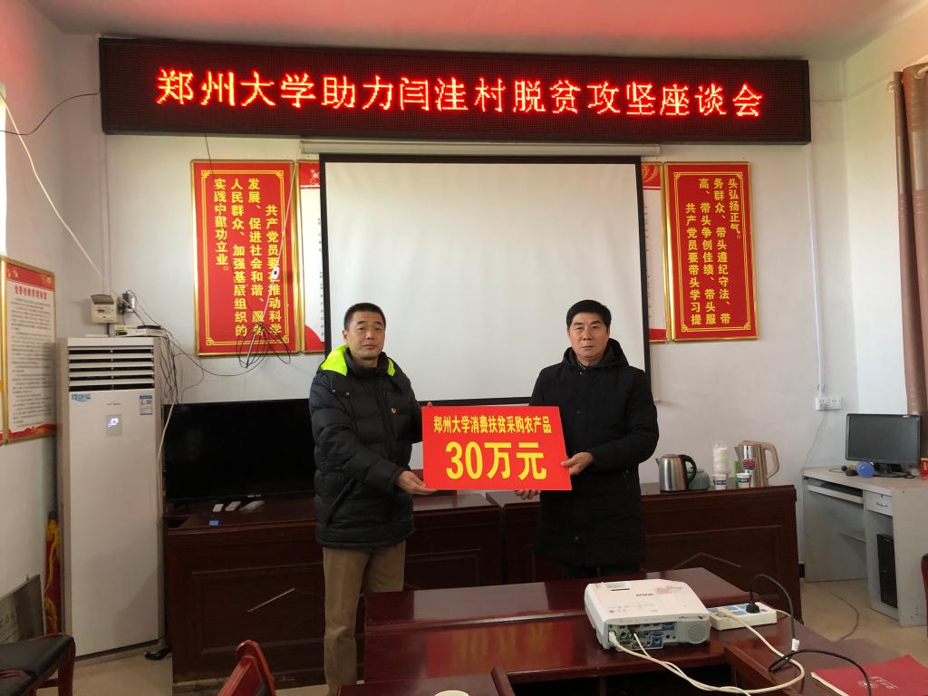 在閆洼村黨群服務(wù)中心召開的座談會(huì),雙廟街鄉(xiāng)黨委書記劉廣超介紹了近年來(lái)閆洼脫貧攻堅(jiān)情況,對(duì)鄭州大學(xué)長(zhǎng)期以來(lái)關(guān)心支持雙廟街鄉(xiāng)脫貧攻堅(jiān)工作給予充分肯定和感謝。吳宏陽(yáng)對(duì)閆洼村脫貧攻堅(jiān)工作給予了高度評(píng)價(jià),他指出,習(xí)近平總書記在12月3日中央政治局常務(wù)委員會(huì)會(huì)議上發(fā)表的重要講話,為我們做好鞏固脫貧攻堅(jiān)成果工作指明了方向,提供了遵循,我們要認(rèn)真學(xué)習(xí)習(xí)近平總書記重要講話精神,切實(shí)按照上級(jí)的安排部署,抓好抓實(shí)當(dāng)前鞏固脫貧攻堅(jiān)成果等各項(xiàng)工作,確保工作取得實(shí)效。他強(qiáng)調(diào),脫貧摘帽不是終點(diǎn),而是新生活、新奮斗的起點(diǎn),我們要嚴(yán)格落實(shí)“四個(gè)不摘”要求,緊盯鞏固拓展脫貧攻堅(jiān)成果銜接好鄉(xiāng)村振興,做好“十四五”脫貧攻堅(jiān)鞏固拓展規(guī)劃,推動(dòng)脫貧攻堅(jiān)與鄉(xiāng)村振興接續(xù)發(fā)展;他指出,作為閆洼村的親人,鄭州大學(xué)也將繼續(xù)為閆洼村致富奔小康提供大力幫助。同時(shí)勉勵(lì)鄭州大學(xué)駐村工作隊(duì)要弘揚(yáng)焦裕祿同志“三股勁”,大力踐行對(duì)群眾的那股親勁、抓工作的那股韌勁、干事業(yè)的那股拼勁,以愛之名,為愛堅(jiān)守,做深受老百姓喜愛歡迎的駐村干部。會(huì)上,吳宏陽(yáng)代表學(xué)校現(xiàn)場(chǎng)采購(gòu)了價(jià)值30萬(wàn)元的閆洼村農(nóng)產(chǎn)品,并捐贈(zèng)了體育用品。