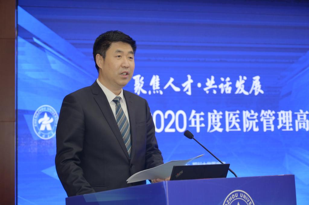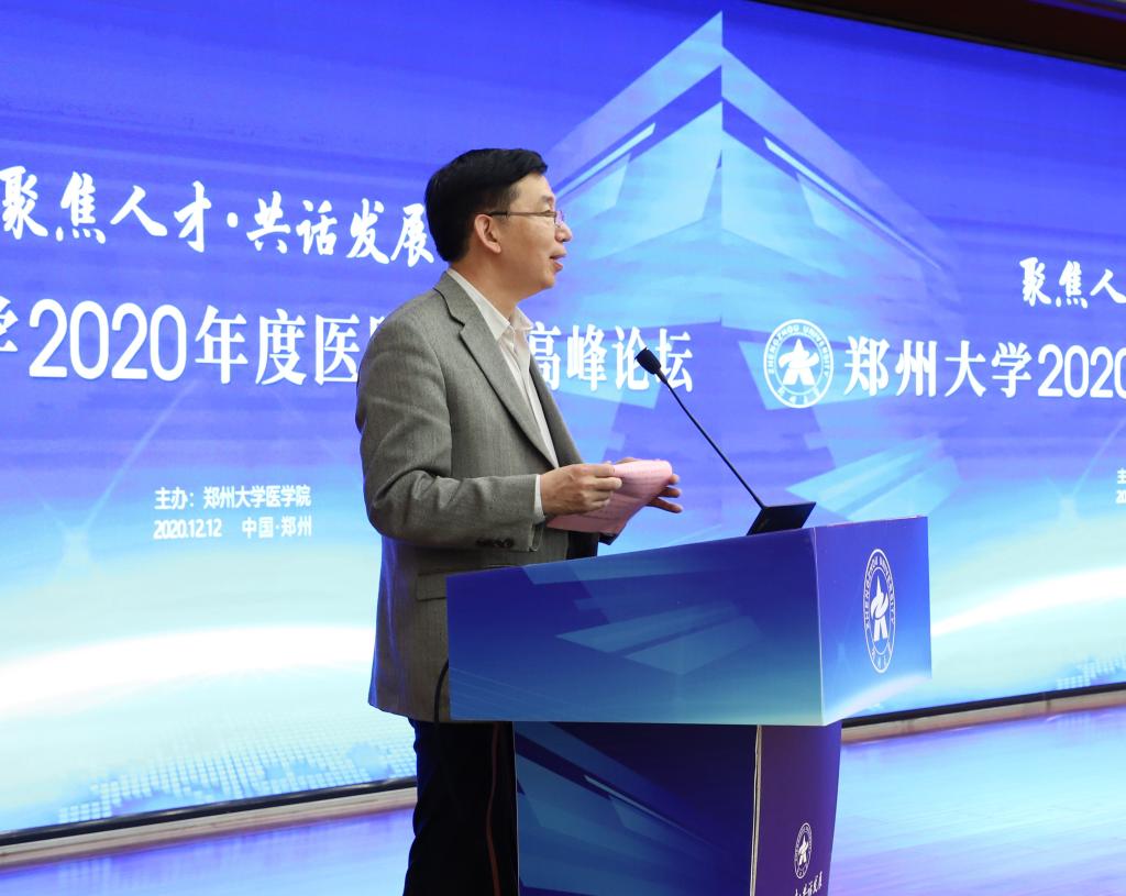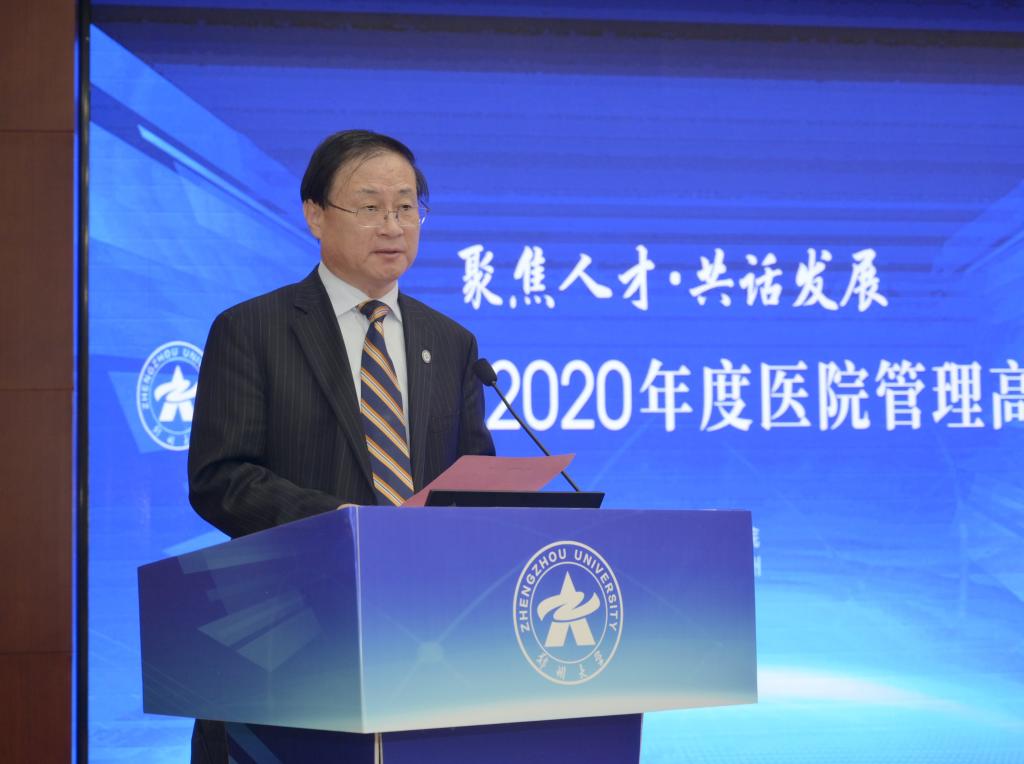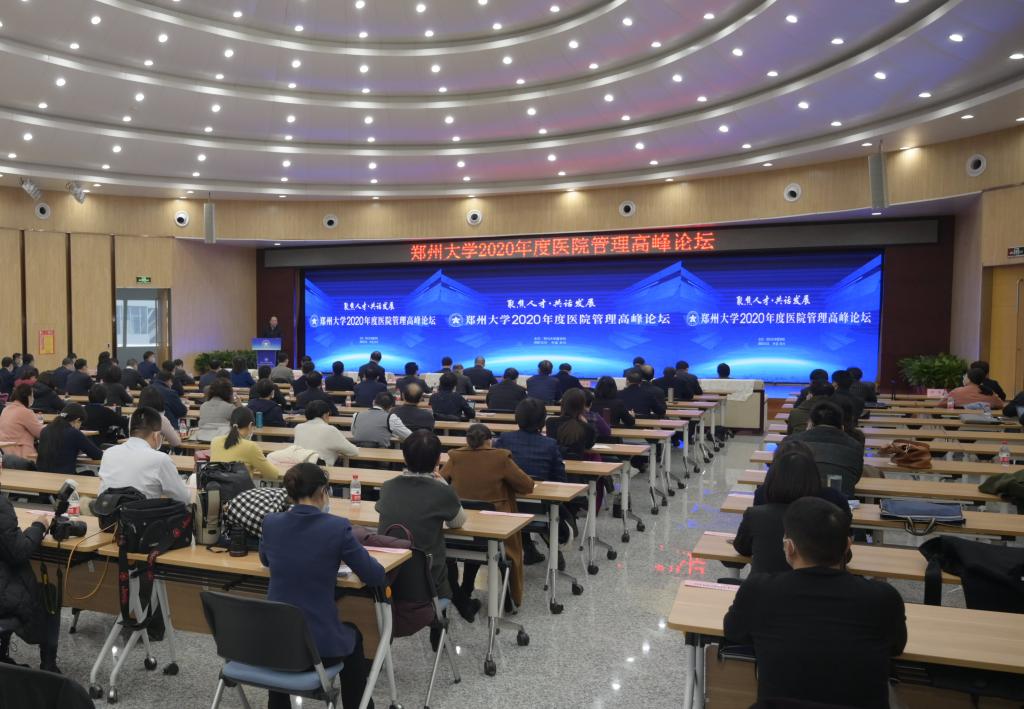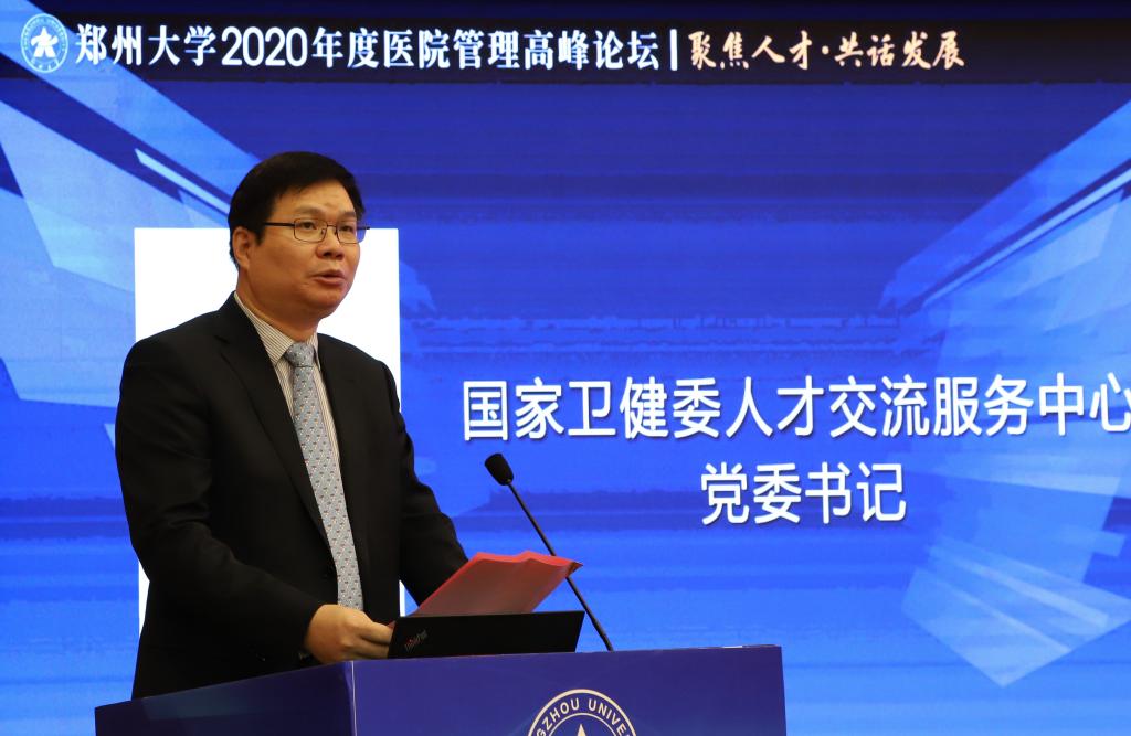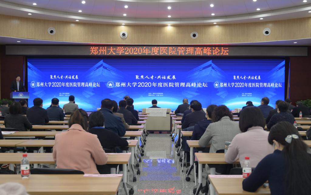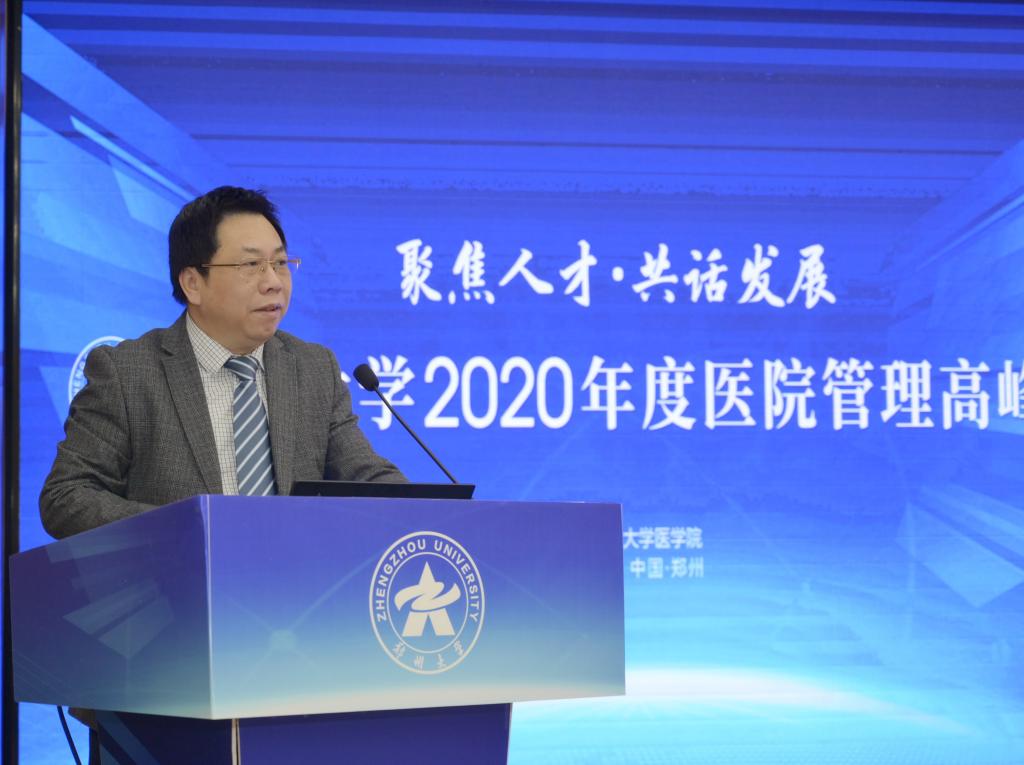 12月12日,鄭州大學以“聚焦人才·共話發展”為主題舉辦2020年度醫院管理高峰論壇。中國研究型醫院學會會長何振喜,國家衛生健康委人才交流服務中心黨委書記張俊華,中南大學黨委常委、副校長陳立章等,省衛生健康委員會黨組書記、主任闞全程,河南省教育廳黨組書記、廳長鄭邦山,省教育廳黨組成員、副廳長張傳廣,鄭州大學黨委書記宋爭輝,黨委副書記、醫學院黨工委書記谷振清,副校長、第一附醫院院長劉章鎖,副校長、醫學院院長董子鋼等出席。省衛健委和省教育廳相關處室負責人,學校有關職能部門、醫學院、醫學科學院、10所附屬醫院負責同志等參加論壇。谷振清、劉章鎖、董子鋼分別主持論壇有關環節。根據疫情防控需要,論壇采用線上線下相結合的方式舉辦,主會場設在第一附屬醫院鄭東院區第二報告廳,各附屬醫院另設立分會場。