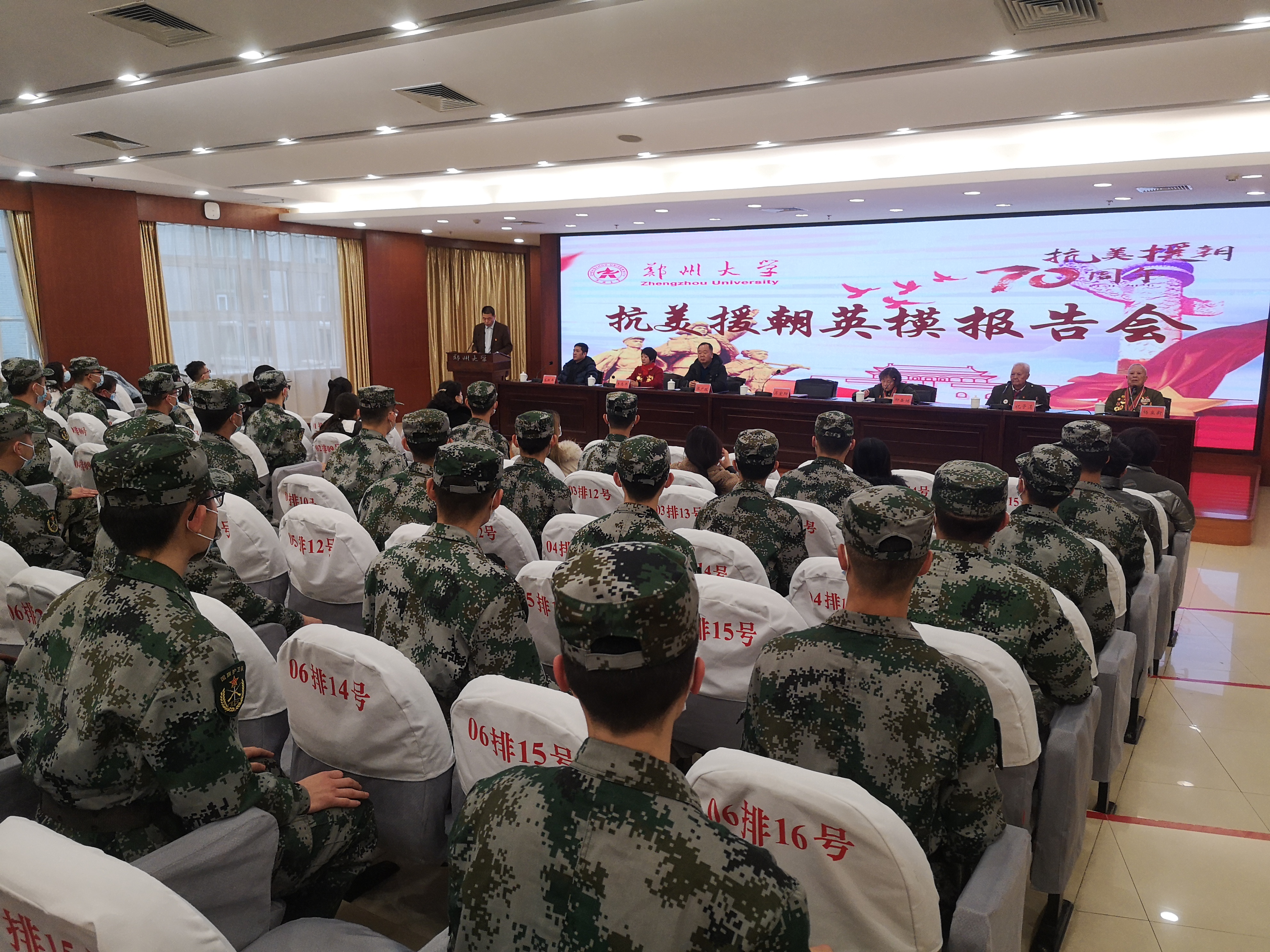 使命呼喚擔當,榜樣引領未來。為深入學習領會、全面貫徹落實習近平總書記在紀念中國人民志愿軍抗美援朝出國作戰70周年大會上的重要講話和黨的十九屆五中全會精神,大力弘揚和繼承偉大的抗美援朝精神,激勵廣大師生不忘報國初心,勇擔責任使命,2020年12月31日下午,鄭州大學隆重舉行抗美援朝英模報告會。電影《英雄兒女》中王芳的原型、在上甘嶺戰役中榮立戰功的陣地“百靈鳥”、老英雄柳岳繼,志愿軍總部通訊電報站站長、老英雄楊立新,志愿軍高射炮兵、一等戰功獲得者、老英雄祝子清,河南省優秀共產黨員、河南省道德模范、感動中原十大愛心人物李志平為師生作報告。校黨委常委、副校長吳宏陽出席,武裝部負責同志、各院系優秀輔導員代表及國旗護衛隊隊員參加報告會。