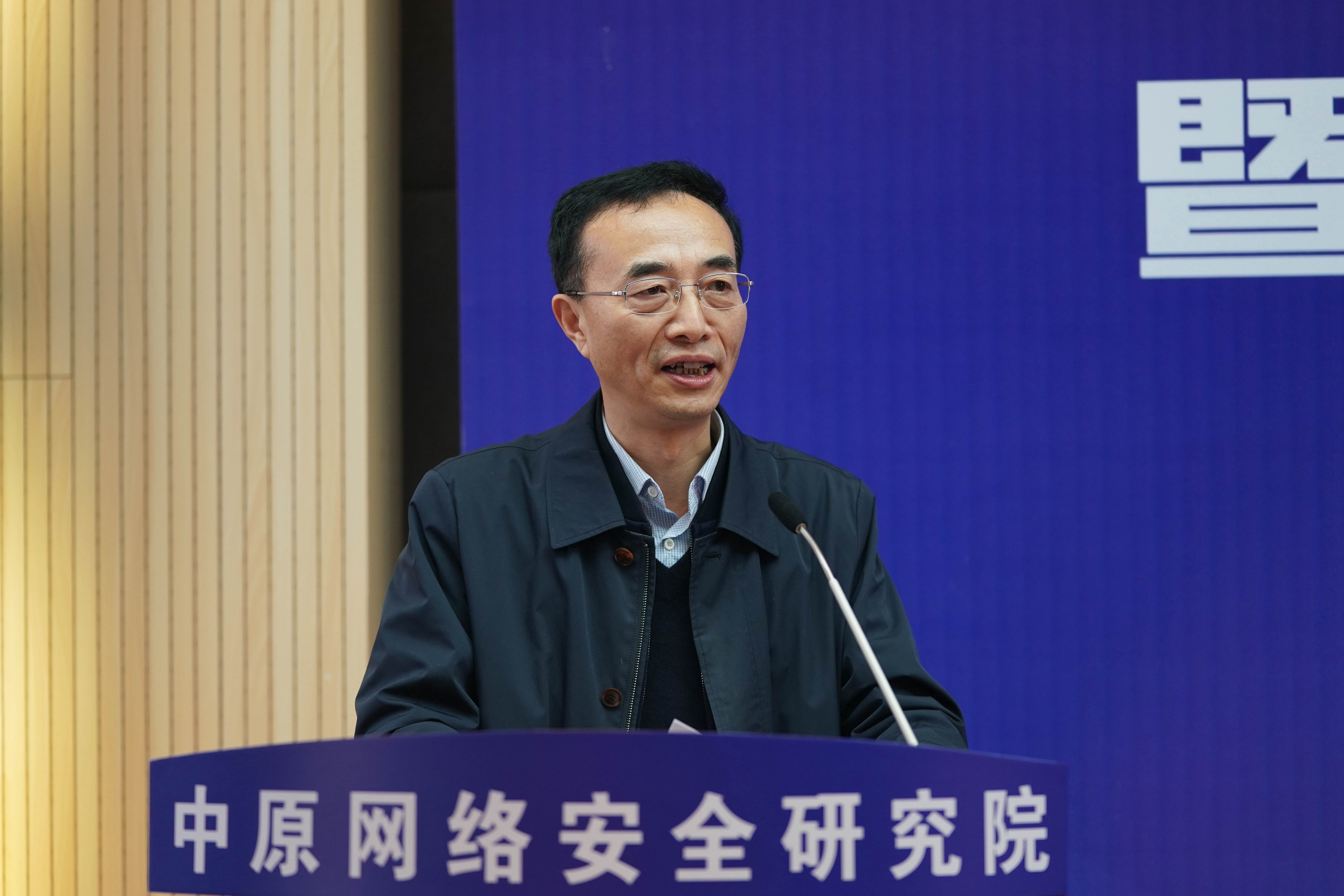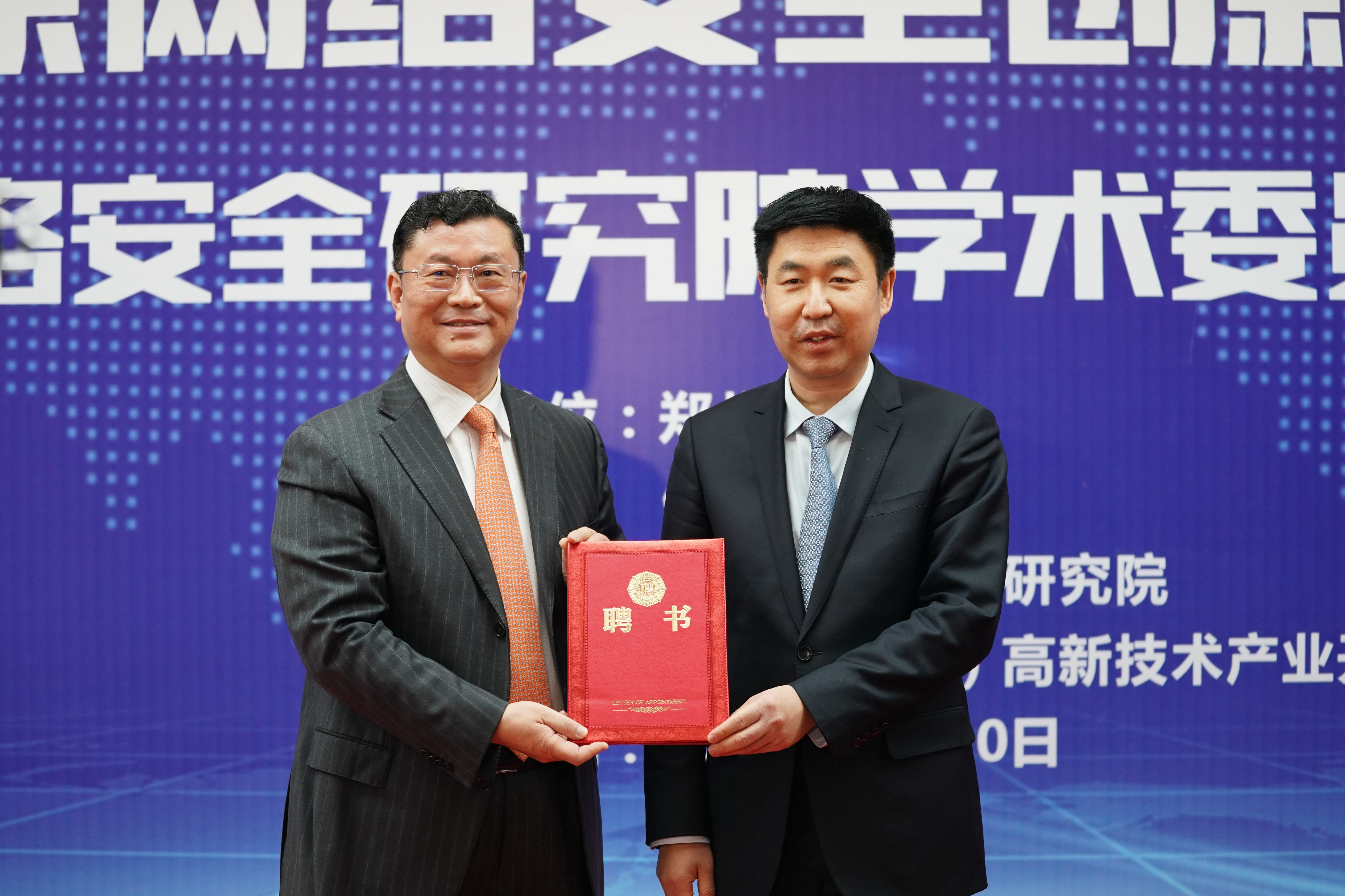宋爭輝為中原網絡安全研究院院長胡傳平、副院長石磊、索敏杰、張大龍頒發了聘書。梁曉婧為學術委員會主任鄔江興頒發了聘書。鄔江興和劉炯天為中原網絡安全研究院揭牌。中原網絡安全研究院院長胡傳平匯報了研究院建設規劃。
