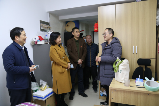 孫銀正一行來到博士后研究人員的住處,了解了他們在??蒲泄ぷ鳌⒓彝ド钋闆r,送上了春節慰問品,并祝他們在新的一年身體健康、闔家幸福。