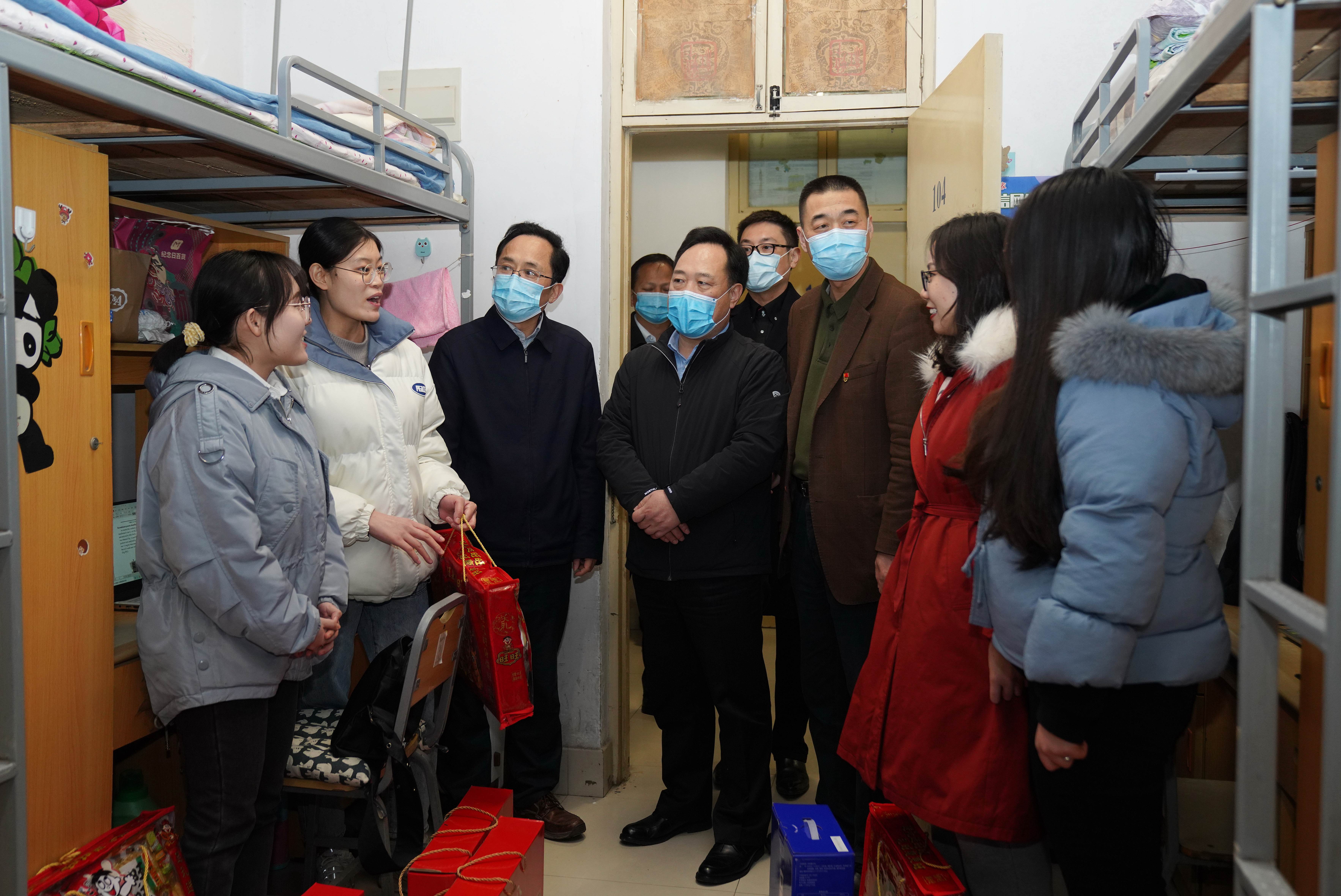 校領導在菊園、松園學生宿舍看望了留校學生代表,向同學們表達了新春問候和美好祝福,并詳細詢問了他們的學習和生活情況,鼓勵大家在做好疫情防控的同時,利用寒假時間合理安排學習生活,盡可能地充實自己,把學習科研抓好,把身體鍛煉好。校領導還為留校學生們送上了慰問品。