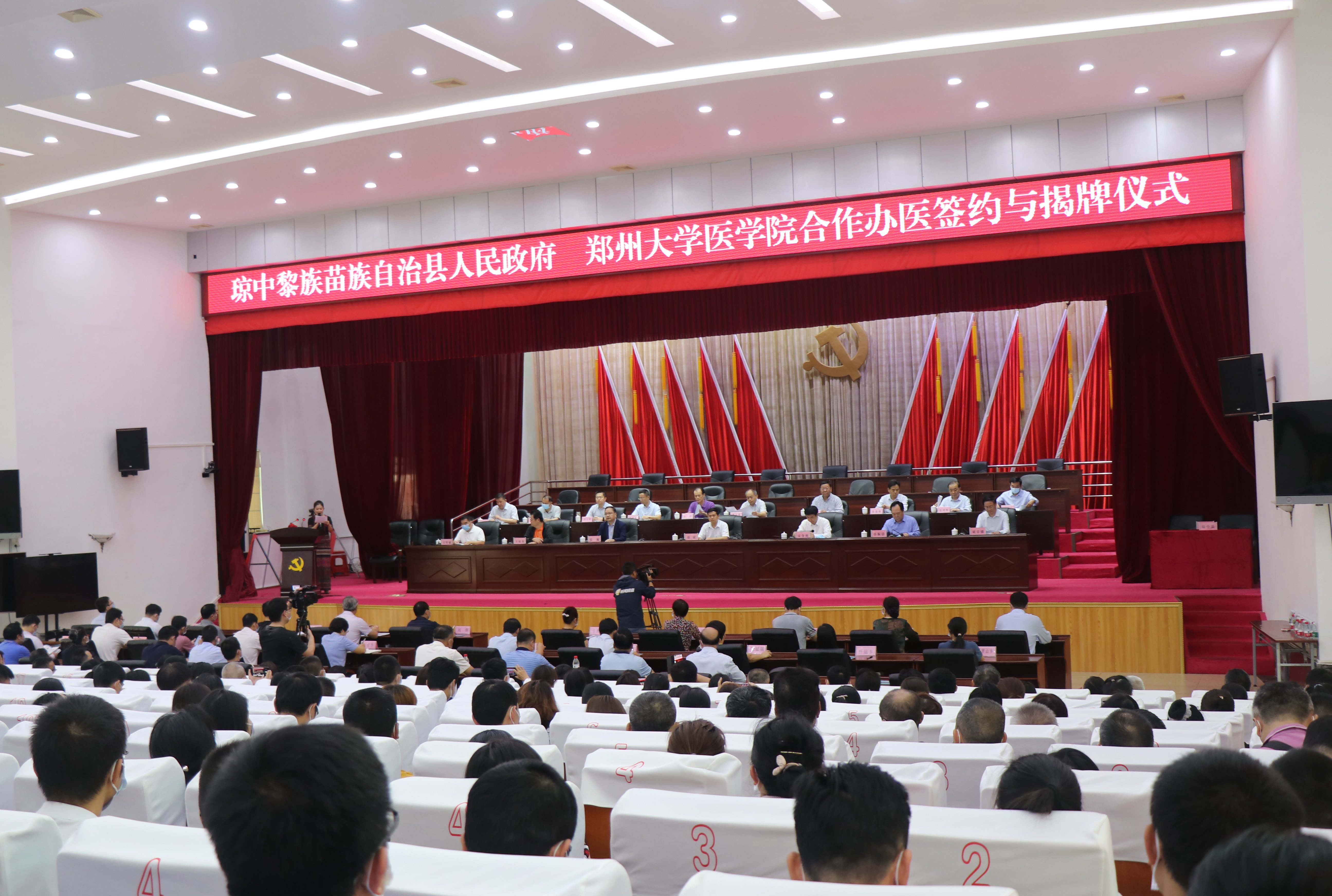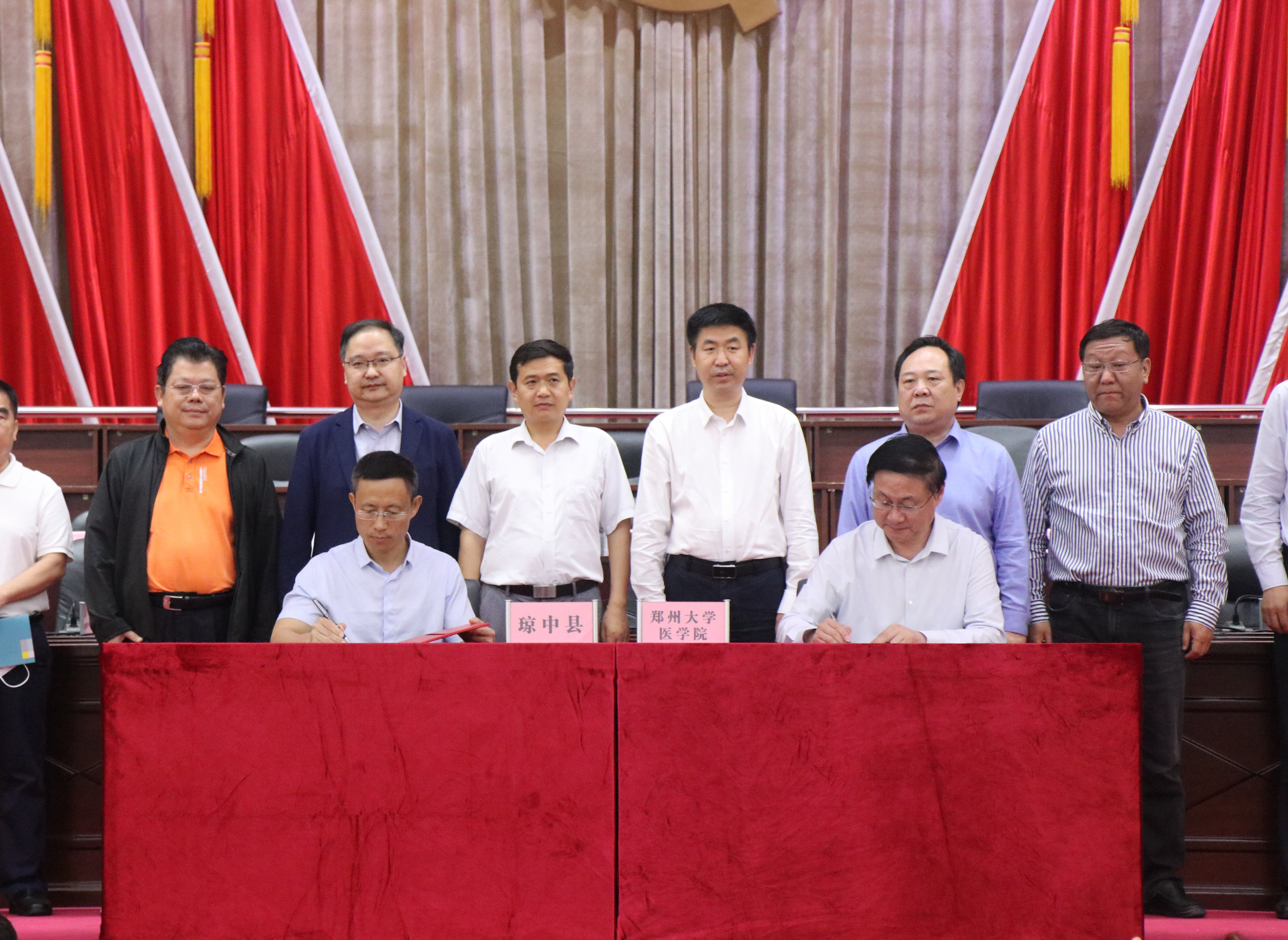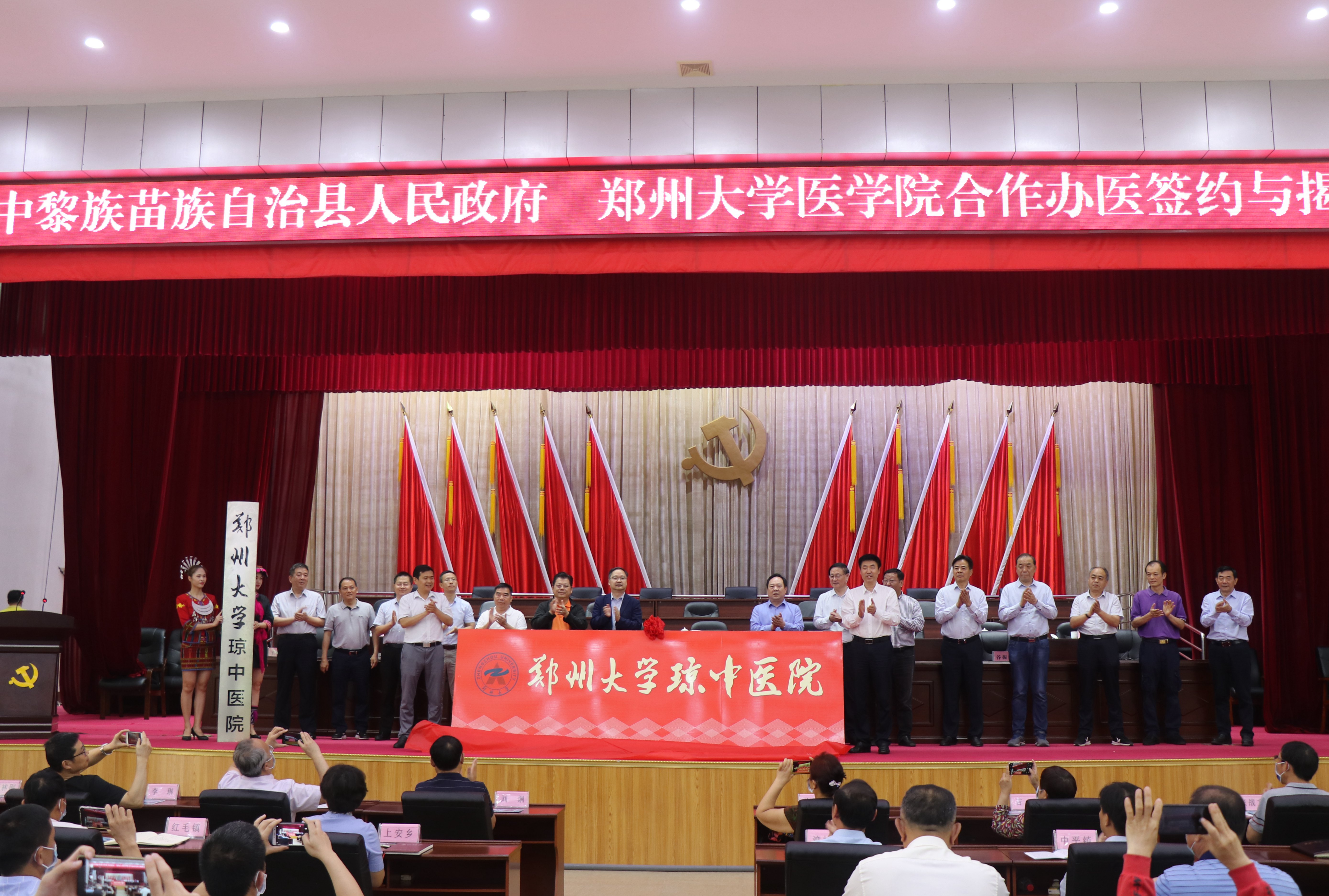 劉章鎖和瓊中縣副縣長陳海濱代表雙方簽署《海南省瓊中黎族苗族自治縣人民政府鄭州大學醫學院托管協議》。宋爭輝、徐斌共同為鄭州大學瓊中醫院揭牌。