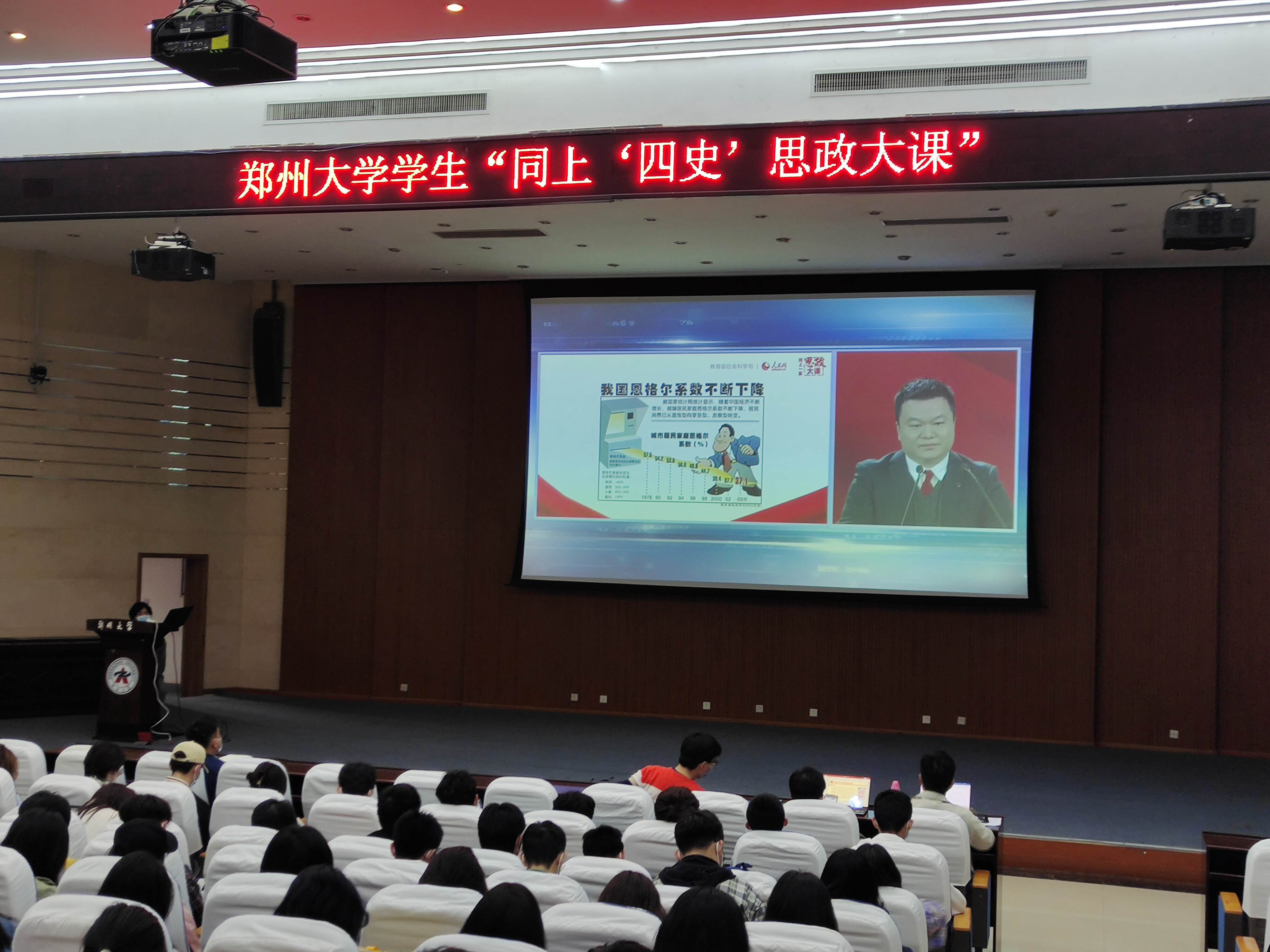 根據活動安排,4月24日下午2點,第一堂“同上黨史思政大課”在線舉行。北京師范大學趙朝峰教授、武漢大學盧勇教授、南京航空航天大學何畏教授分別上了題為《馬克思主義與中國共產黨的百年輝煌》《中國共產黨與中華民族的偉大復興》和《中國共產黨革命精神的形成和傳承》的黨史課程。鄭州大學七萬余名本科生、研究生和馬克思主義學院全體教師,分別在教室、報告廳、實驗室、宿舍等場所統一聆聽了課程。
