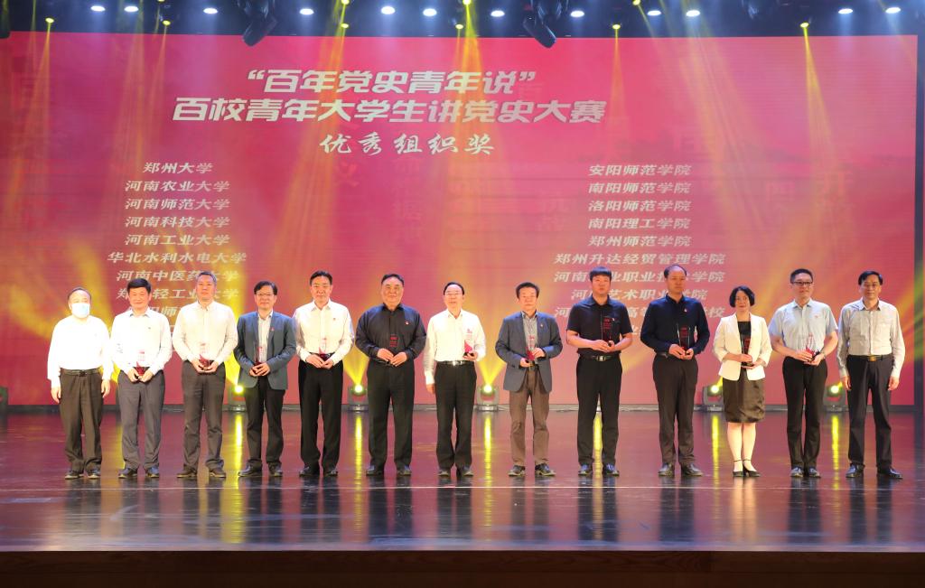 近日,由中共河南省委高校工委、河南省教育廳、共青團河南省委、河南廣播電視臺聯合舉辦的“‘百年黨史青年說’——百校大學生講黨史大賽頒獎典禮暨匯報展演活動”在鄭州舉行。鄭州大學榮獲優秀組織獎,學校選送的由大學生藝術中心語言與表演藝術團表演的《糖丸》、信息管理學院的《薪火相傳,筑夢未來》、教育學院的《大山里的女兒》以及政治與公共管理學院的《學習中共黨史,凝聚巾幗力量》等節目獲得三等獎。