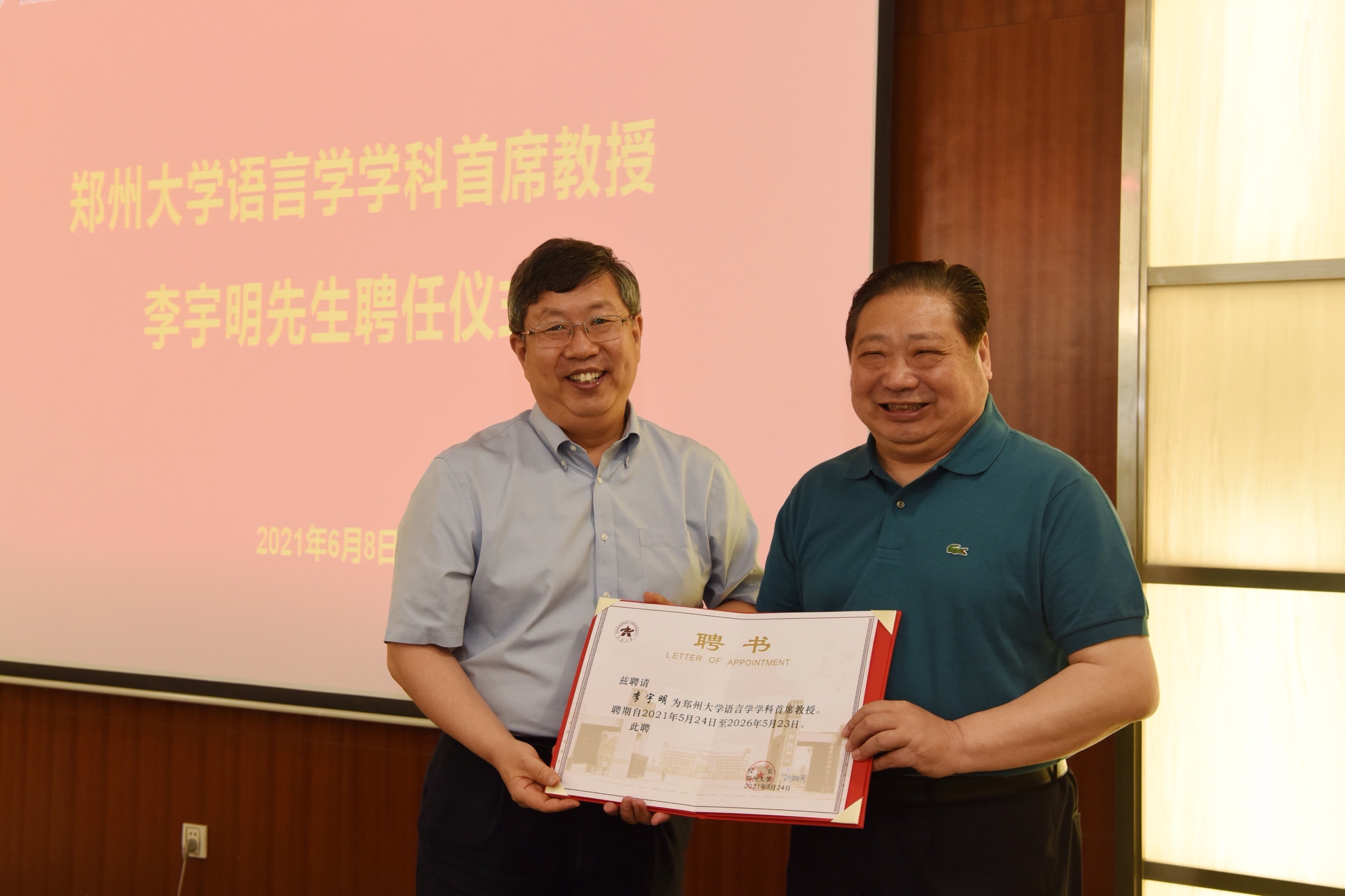 6月8日下午,北京語言大學李宇明教授受聘為鄭州大學語言學學科首席教授。聘任儀式在主校區舉行,省政協副主席、鄭州大學校長劉炯天出席。學校相關單位負責同志,文學院教師代表參加聘任儀式。校黨委常委、副校長韓國河主持儀式。