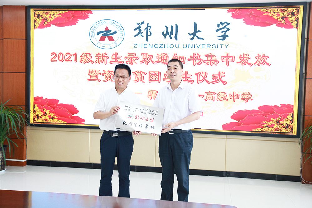 隨后,吳宏陽向劉成章授予新的鄭州大學優質生源基地牌匾,并同學生處、招生辦公室主要負責同志一起為124名鄲城一高畢業的鄭大新生現場發放錄取通知書和學習用品。儀式上還為即將邁入鄭大校園的20名建檔立卡學生發放了助學金。