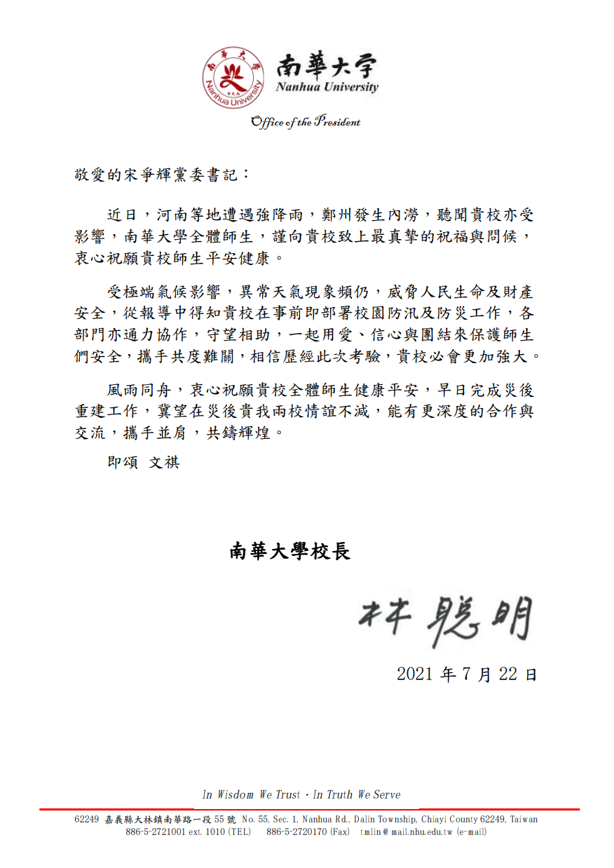南華大學林聰明校長表示:“從報導中得知貴校在事前即部署校園防汛及防災工作,各部門亦通力協作,守望相助,一起用愛、信心與團結來保護師生們安全,攜手共度難關,相信歷經此次考驗,貴校必會更加強大”。