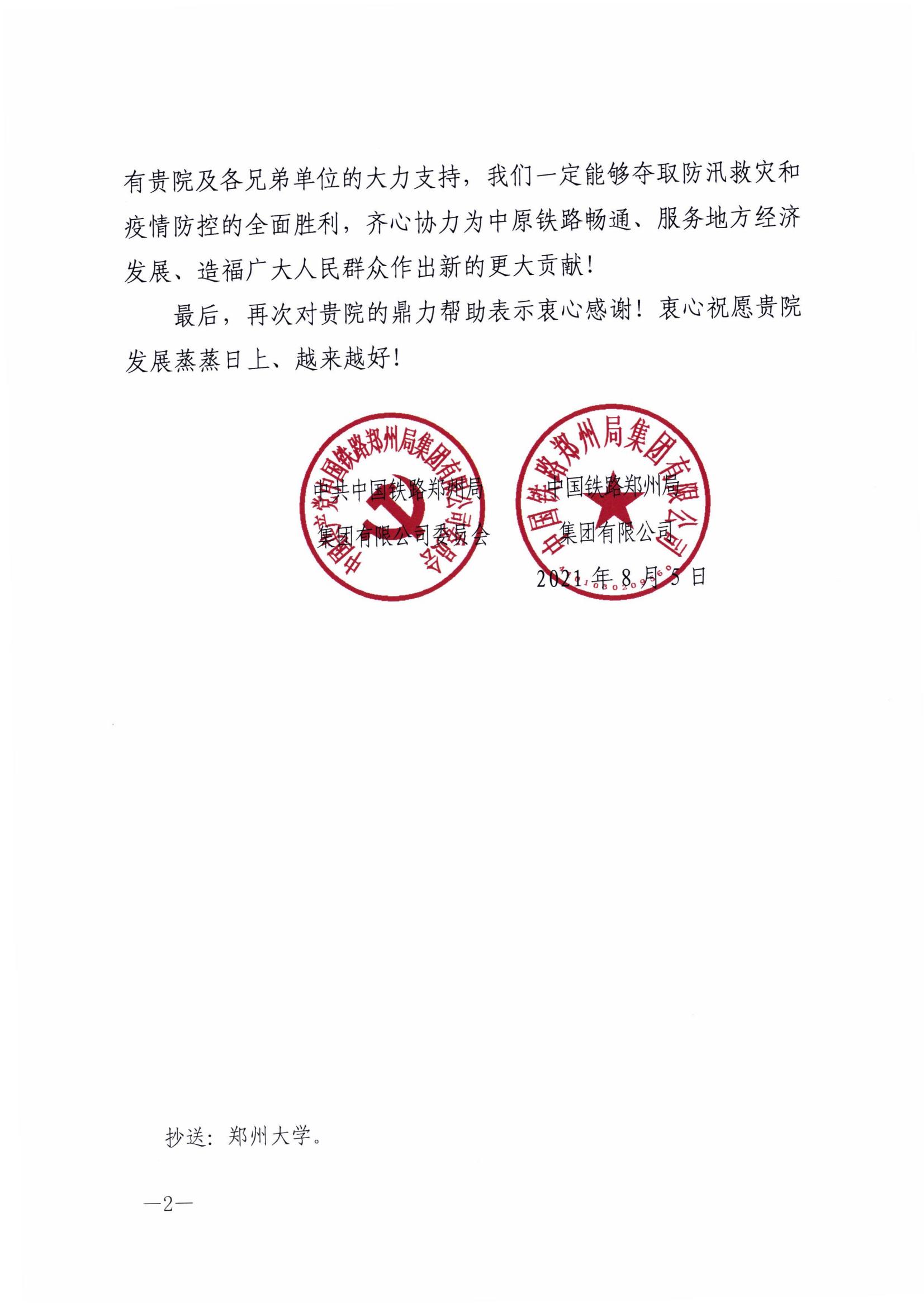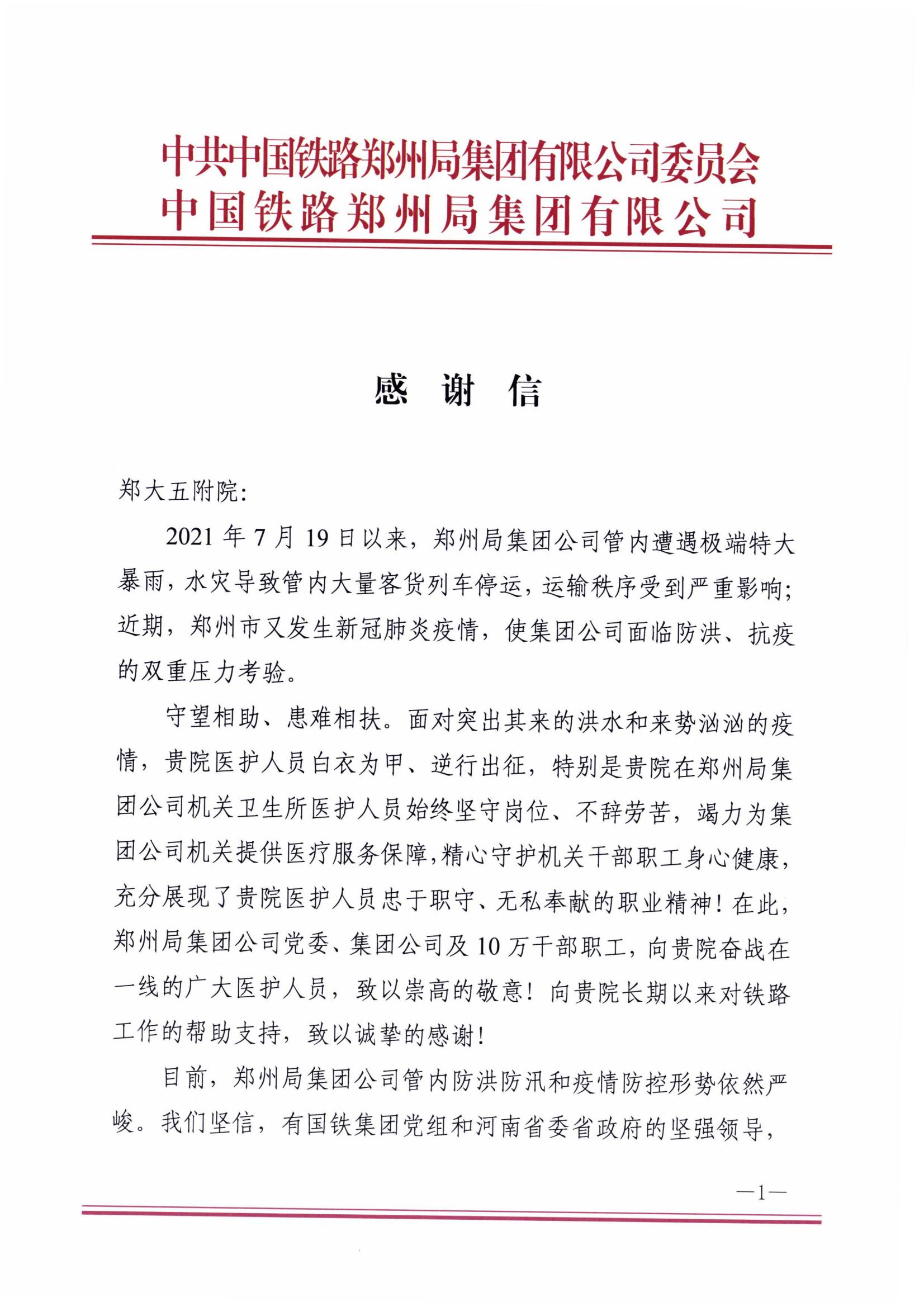 8月5日,中國鐵路鄭州局集團有限公司向鄭州大學(xué)五附院發(fā)來感謝信,對近期連續(xù)發(fā)生的極端特大暴雨和新冠肺炎疫情以來,醫(yī)院直屬鄭州局集團公司機關(guān)衛(wèi)生所醫(yī)護人員堅守崗位、不辭辛苦,為該公司機關(guān)提供醫(yī)療服務(wù)保障,守護干部職工身體健康的事跡給予高度評價。