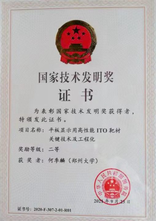 11月3日,2020年度國家科學技術(shù)獎勵大會在人民大會堂隆重召開。鄭州大學主持完成的“平板顯示用高性能ITO靶材制備關(guān)鍵技術(shù)及工程化”項目榮獲2020年度國家技術(shù)發(fā)明獎二等獎,項目主持人為何季麟院士,材料科學與工程學院孫本雙教授和舒永春教授等為主要完成人。