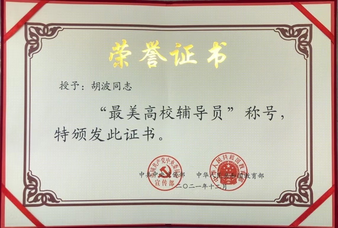 胡波從事輔導員工作以來,先后榮獲全國輔導員素質能力大賽一等獎、河南省高校輔導員年度人物,主持教育部人文社會科學研究一般項目(高校輔導員研究專項)、河南省高校思想政治工作精品項目。2019年3月18日,作為河南省高校輔導員唯一代表,胡波參加了由習近平總書記主持召開的學校思想政治理論課教師座談會,受到總書記親切接見。胡波在日常工作中,始終堅守一線,苦練內功。探索談心談話“五步法”,力求用真心將情理入腦入心;創新工作形式,成立學黨史“青年百人團”,致敬“先輩同齡人”,用青春方式講好信仰故事;善于把握育人契機,身處抗洪戰“疫”重災區,用好現實素材,上好大思政課;組建學生理論宣講實踐團,引導學生走出課本、走進鄉村,把思政小課堂與社會大課堂結合起來,在重大戰略中貢獻青年力量。受聘為全省高校優秀輔導員黨的十九大精神校園巡講團、全省教育系統學習貫徹落實習近平總書記教師節重要寄語精神報告會宣講團成員,用身體力行踐行黨的創新理論。