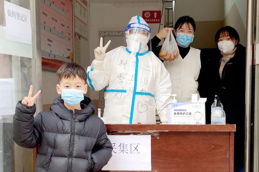 “阿姨,你們辛苦了,這是我媽媽剛剛親手做的炸糖糕,送給你們嘗嘗。”1月8日,二七區大學南路南郡小區核酸采樣點,有一個小男孩,在采集完核酸后,重新返回采樣點,給正在緊張工作的三附院醫療隊員岳晏如和隊員送來了熱騰騰的炸糖糕。炸糖糕除了甜蜜,還包含著對醫務人員滿滿的謝意,給連續奮戰的他們帶來了溫暖和感動。