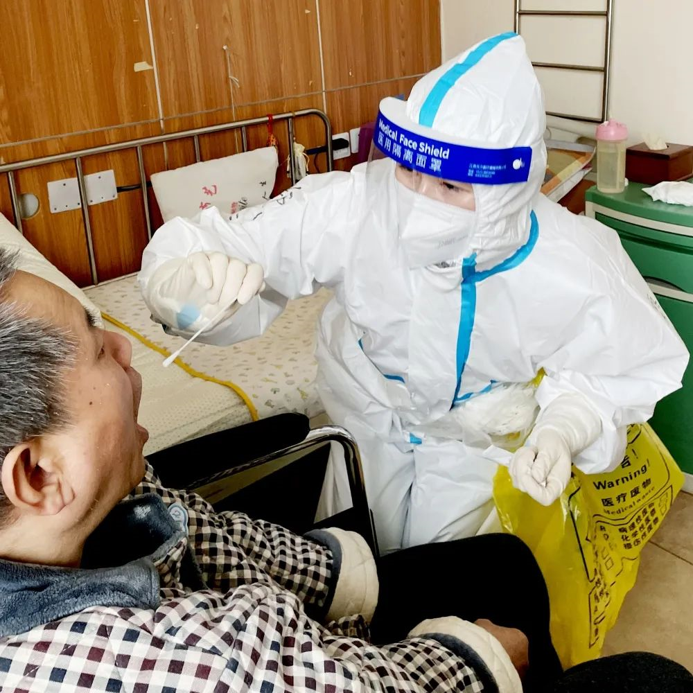 在二七區人和路街道王胡砦福星養老服務中心,居住著很多高齡老人、臥床病人及其他行動不便的老人。天氣寒冷,為了給這些老人們提供方便,三附院采樣隊員郭曉燕就和社區工作人員上門采樣,“今天咱們組采樣量很大,你們都留在采樣點吧,需要上門采樣的這80個人,我一個人去就行。”“女漢子”郭曉燕跟自己的隊友說。在社區工作人員指引下,每到一個房間,郭曉燕都會細心的叮囑老人不要緊張,大家都為她的溫柔體貼點贊。