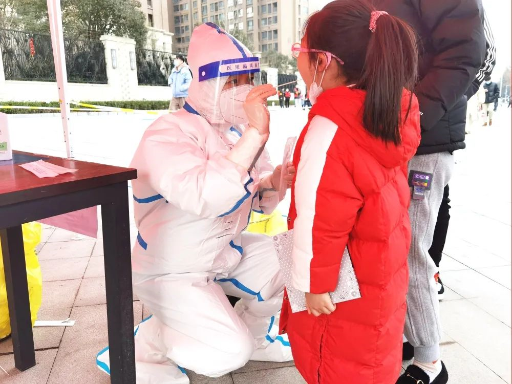 在高新區公園道1號璽園核酸采樣點,三附院核酸采樣隊員徐競帆每次給小朋友采樣前都會蹲下或單腿跪下,全副武裝的她就從“大白”一下子變成了“小白”,小朋友們都說她很可愛。徐競帆是兒童保健科的一名護士,她說平常的工作中就是和小朋友們打交道,很理解小朋友們面對要采核酸心里會緊張、害怕,“我蹲下來和孩子保持一樣的高度交流,他們就不會那么害怕了。”徐競帆說道。