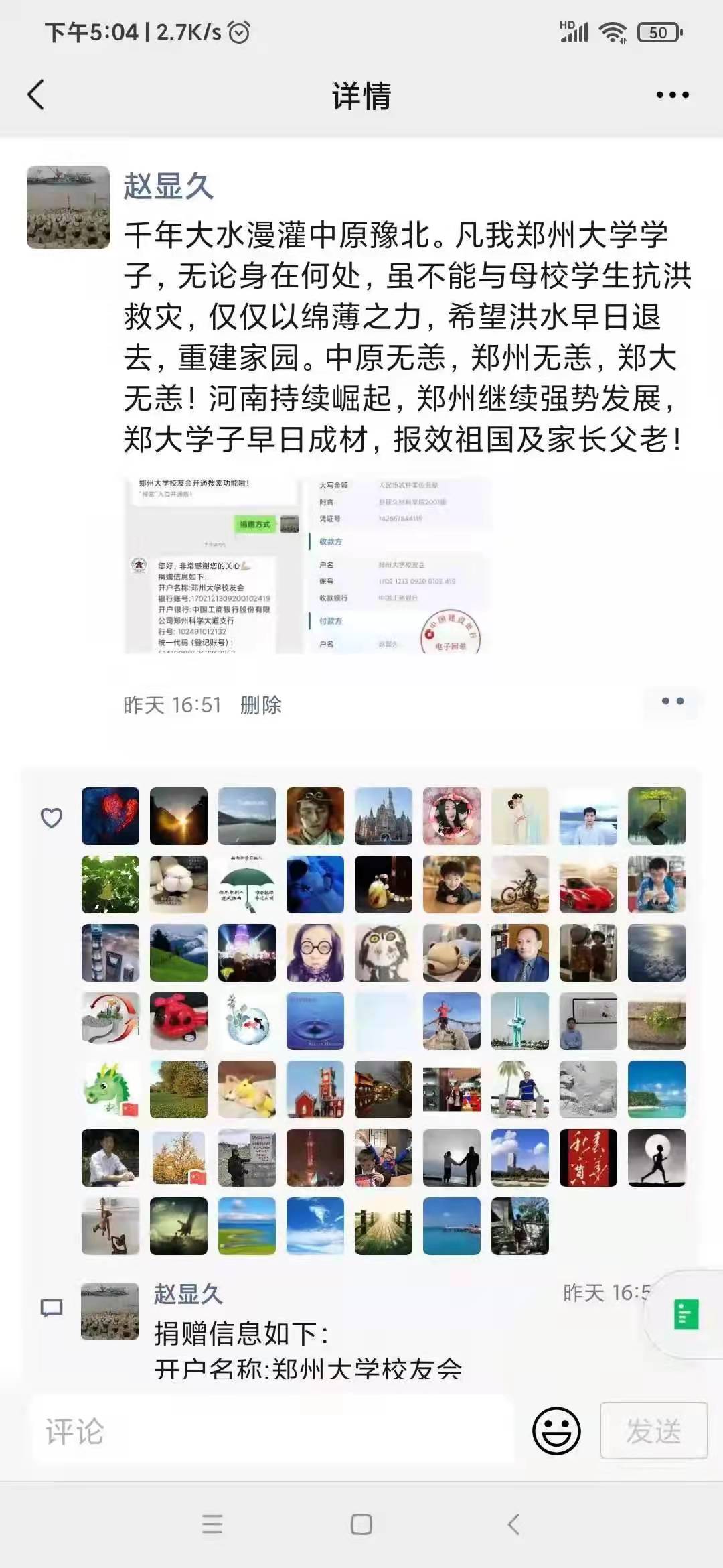 “千年大水漫灌中原豫北。凡我鄭州大學(xué)學(xué)子,無論身處何處,雖不能與母校學(xué)生抗洪救災(zāi),僅以綿薄之力,希望洪水早日褪去,重建家園!”這句令人潸然淚下的號召來自材料科學(xué)與工程學(xué)院2001級校友趙顯久的朋友圈。僅兩天時間,材料科學(xué)與工程學(xué)院2001級校友便籌得人民幣21642.66元。無獨有偶,災(zāi)情發(fā)生后,各個學(xué)院、各年級的校友一呼百應(yīng),積極主動為母校募捐。浙江校友會中不愿意留下姓名的校友、福建校友會(籌)中愛心接力的父子二人、江蘇校友會(籌)微信群里的捐贈接龍……風(fēng)雨面前,每一份愛心的匯聚,都為鄭州大學(xué)帶來雨后的陽光。