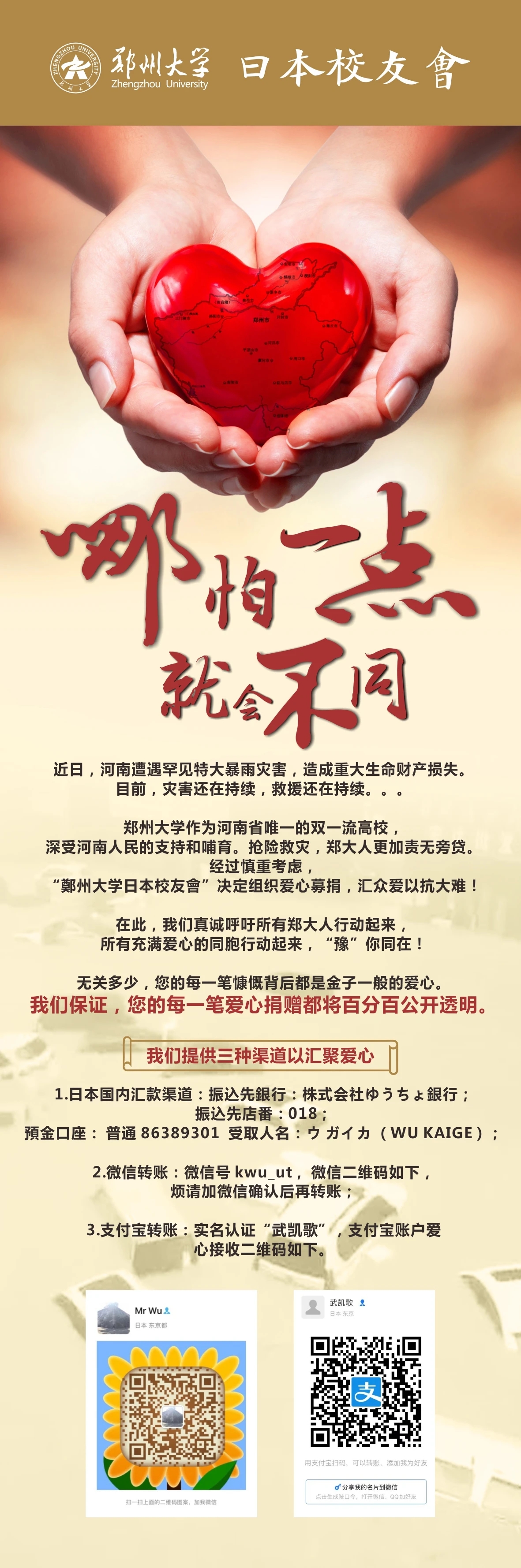 使人感動的不僅僅有鄭大校友,還有眾多來自社會各界的愛心人士。華盛頓校友會收到了一位七十多歲老先生的捐款,老先生看到新聞后,主動找到華盛頓校友會捐贈1000多美元,他說:“我雖然不是河南人,也沒有在鄭州大學(xué)讀過書,但是我特別喜歡河南這個地方。”遠在日本的材料科學(xué)與工程學(xué)院2006級校友武凱歌看到新聞后焦慮萬分,他想“一定要做點什么,哪怕一點點兒,就會不同!”他率先提出為家鄉(xiāng)、為母校捐款的提議,日本校友會(籌)負責(zé)人迅速響應(yīng),立即啟動募捐籌劃。臺灣高雄大學(xué)法學(xué)院楊戊龍教授在了解鄭州災(zāi)情之后,很是掛念,“作為老師的本能,想到可能有學(xué)生需要幫助。”于是,他主動聯(lián)系到我校法學(xué)院鄭磊老師,向鄭州大學(xué)捐款10000元,希望幫助鄭大學(xué)子渡過難關(guān)。