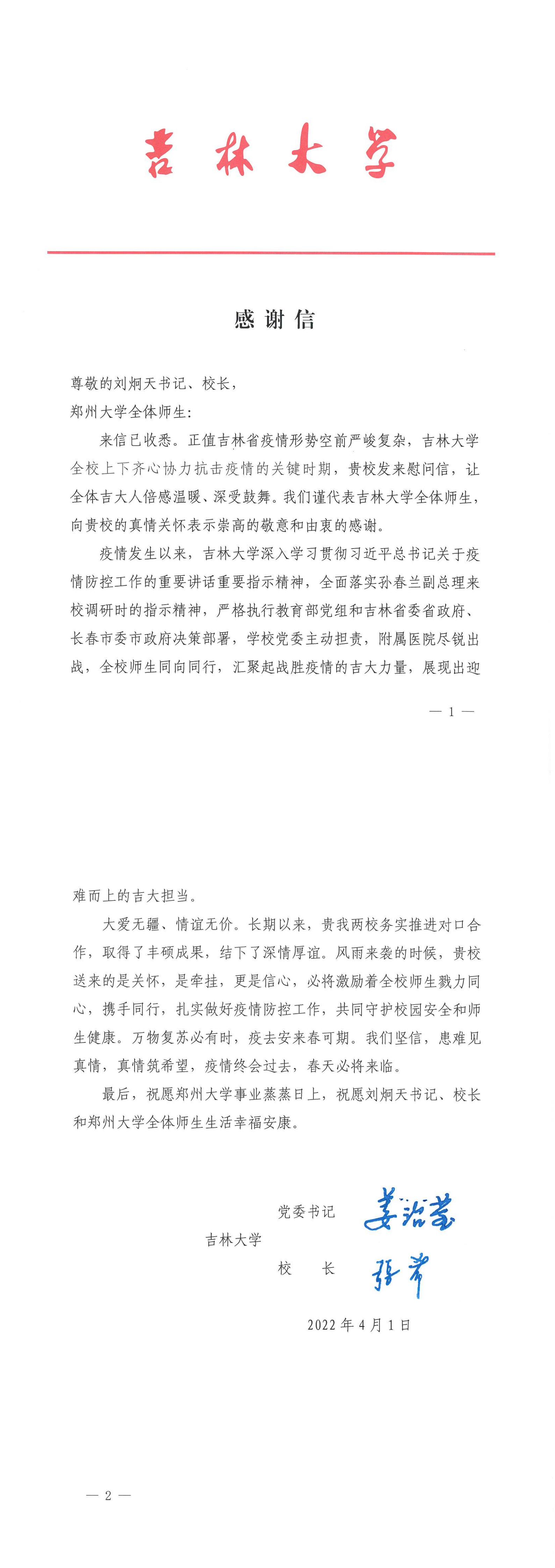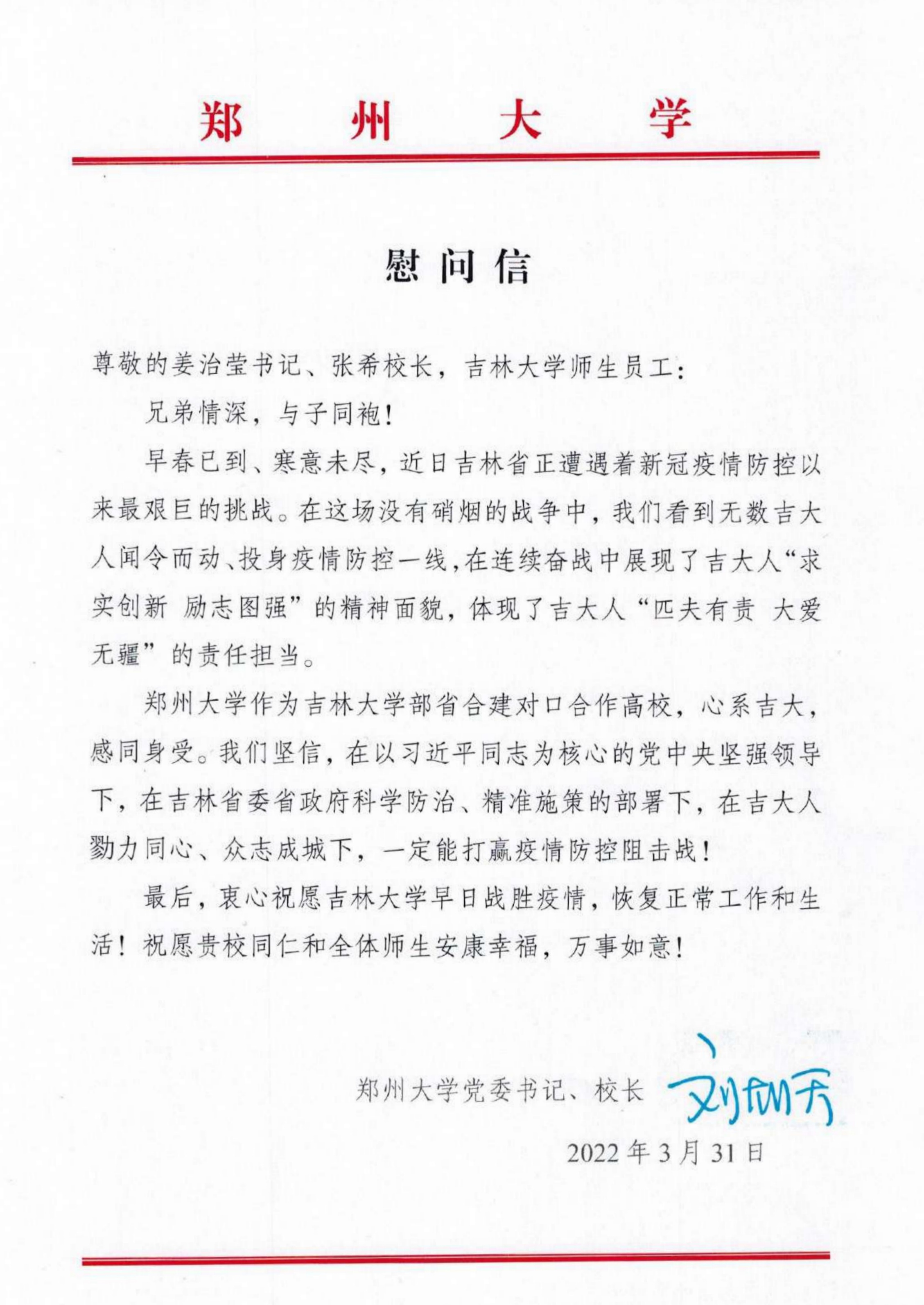 4月1日,吉林大學向鄭州大學發來感謝信。信中表示,在吉林大學全校上下齊心協力抗擊疫情的關鍵時期,鄭大發來慰問信,讓全體吉大人倍感溫暖,深受鼓舞,并向鄭大的真情關懷致以崇高的敬意和由衷的感謝。信中指出。風雨來襲的時候,鄭大送來的是關懷,是牽掛,更是信心,必將激勵著吉大全校師生戮力同心,攜手同行,扎實做好疫情防控工作,共同守護校園安全和師生健康。信中還祝愿鄭州大學事業蒸蒸日上,全體師生生活幸福安康。