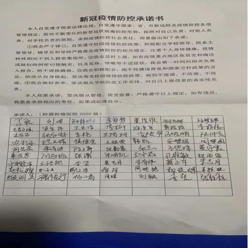 院黨委充分發(fā)揮黨支部的戰(zhàn)斗堡壘作用和黨員干部的先鋒模范作用,通過支部會議和研究生主題班會,把黨的領導貫通到一線,把防控網(wǎng)絡布置到一線,確保疫情防控網(wǎng)絡全覆蓋。全院師生紛紛表態(tài)堅決貫徹落實學校防疫工作要求,簽下新冠疫情防控承諾書。