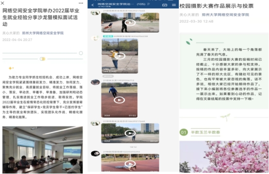 封閉的校園阻擋不了學院師生豐富學習生活的熱情。學院聚焦科學防控、倡導健康生活,以豐富課余文化活動為導向,以打造精彩線上活動為抓手,打造健康有益、豐富多彩的課余文化生活。學院發起為“畢業班加油”的送祝福活動,同學們通過視頻、文字為畢業生就業、考研送上支持和祝福;舉辦畢業生就業分享沙龍暨模擬面試活動,建立“保研學生+黨員骨干+已簽約學生”為主導的就業幫扶團隊,營造就業氛圍、關愛重點群體、強化典型宣傳;組織“315權益知識”線上答題活動,鼓勵學生提升自我保護意識、權利意識,維護和諧的校園環境;開展“運動健康打卡”系列活動,每日積極打卡強身健體;策劃線上心理微劇本大賽、攝影大賽等豐富的校園文化活動,讓同學們在校生活中展示自我、綻放青春光彩。