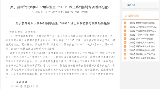 為進一步促進畢業生更高質量更充分就業,大學生就業創業指導服務中心深入實施“2 30”工程,錨定疫情防控常態下線上招聘更有實效、更加精準,于4月1日啟動2022屆畢業生“5153”(截止8月31日,歷時5個月,153天)促就業線上招聘系列專項活動。