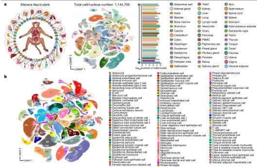 研究團隊基于華大自主研發的單細胞建庫和測序平臺,對成年獼猴45個器官的約114萬個細胞進行了單細胞測序分析,將其分成了113種主要細胞類型和463種細胞亞類,搭建了非人靈長類動物百萬單細胞交互式資源網站。