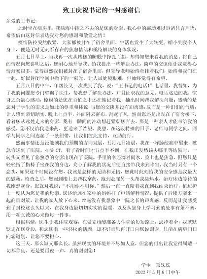 5月9日凌晨3點多,口腔醫學院2018級學生鄭姝瑤腹部絞痛,凌晨5點多加重,來沖沖緊急聯系120送至鄭大一附院急救處理。口腔醫學院黨委書記王慶祝得知情況后,立馬趕往醫院,親自陪同并協調醫院做好應急處置,根據病情協調辦理了住院手續,全程陪同做CT診斷、取藥、接熱水。學生和家長十分感激,學生給王書記寫了一封飽含深情的感謝信,在信中說到:“您一直一直陪著我直到我結束治療,值班護士一度認為您是我的母親。您還給遠在家中的媽媽打了電話解釋情況,提供了后續方案來一起商量對策,讓我的家人放下心來。絲毫沒有我想象中一院之長的距離感,反而是讓我感受到了封校這么久以來,在我身邊最切切實實的溫暖......”經過治療,目前該生病情穩定并好轉。