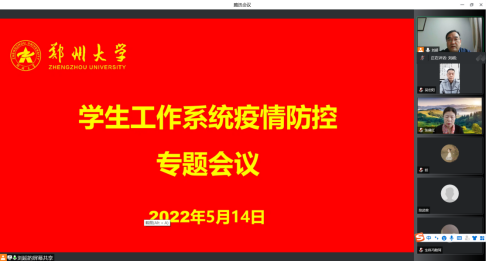 5月14日,鄭州大學召開學生工作系統疫情防控專題會議。校黨委副書記吳宏陽,副校長張倩紅出席會議。黨委學生工作部、人民武裝部、學生處班子及成員,各院(系)主 管學生工作的副書記、全體專兼職輔導員參加會議。會議以線上視頻會議形式進行。
