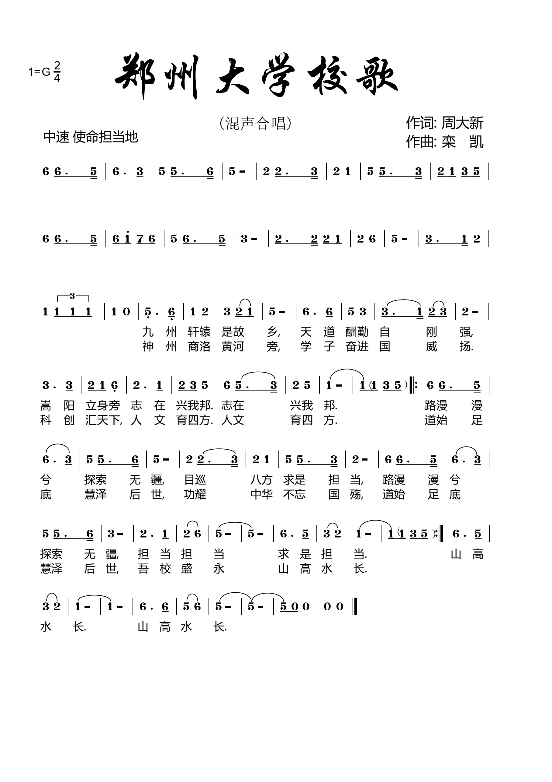 2019年以來,鄭州大學通過面向全校教職工、在校學生、海內(nèi)外校友,及關心、支持鄭州大學建設發(fā)展的社會各界人士開展校歌征集活動,收到了一批優(yōu)秀作品,后經(jīng)多次研討和慎重修改,于2021年完成了校歌創(chuàng)作工作。鄭州大學校歌由豫籍著名作家周大新作詞、著名作曲家欒凱作曲。