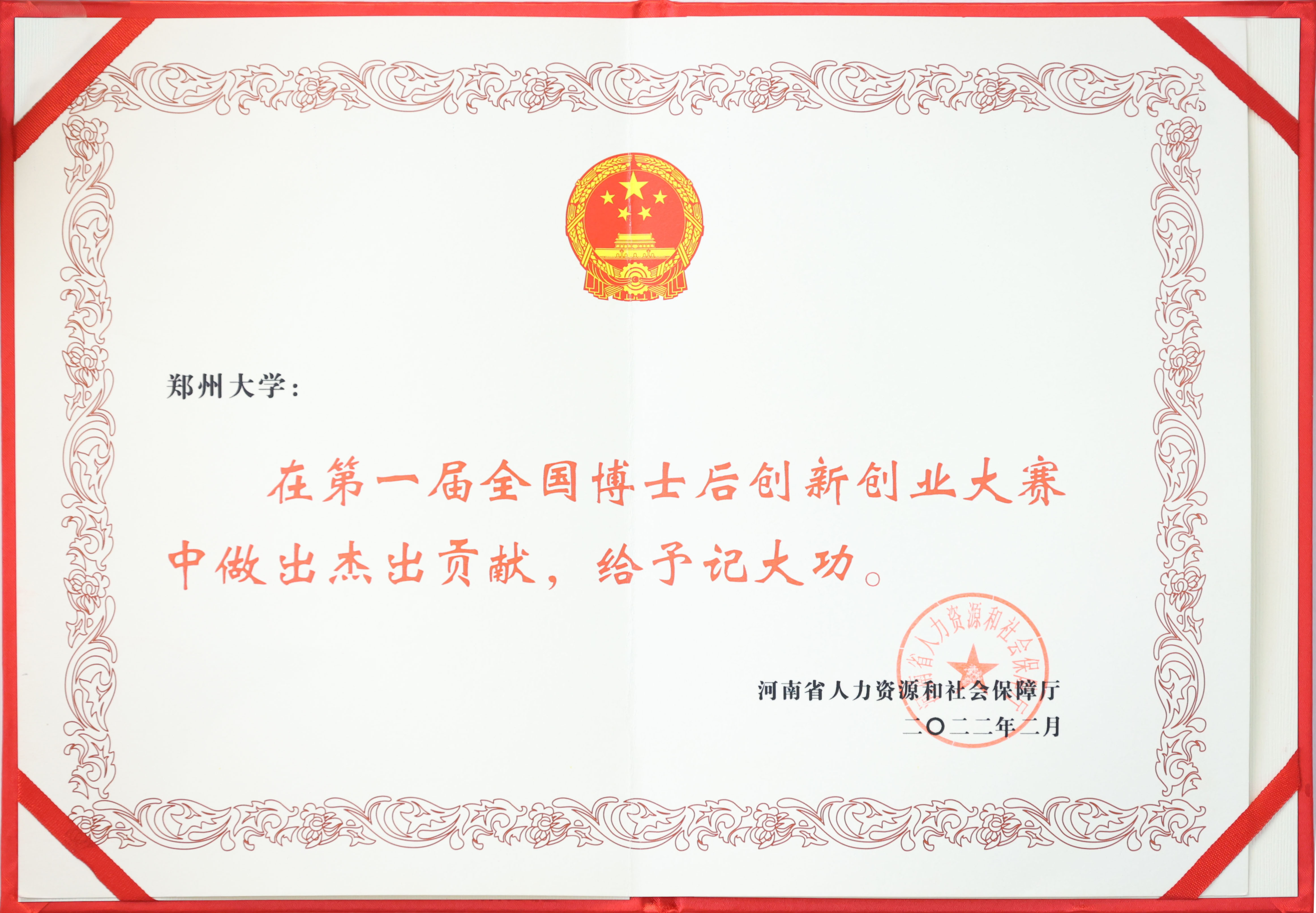 近日,河南省第一屆全國博士后創新創業大賽表彰暨推進博士后工作高質量發展會議在鄭州召開。鄭州大學因在第一屆全國博士后創新創業大賽中成績突出,被河南省人力資源和社會保障廳給與集體記大功,創業大賽金獎獲得者王念念博士受到個人嘉獎。