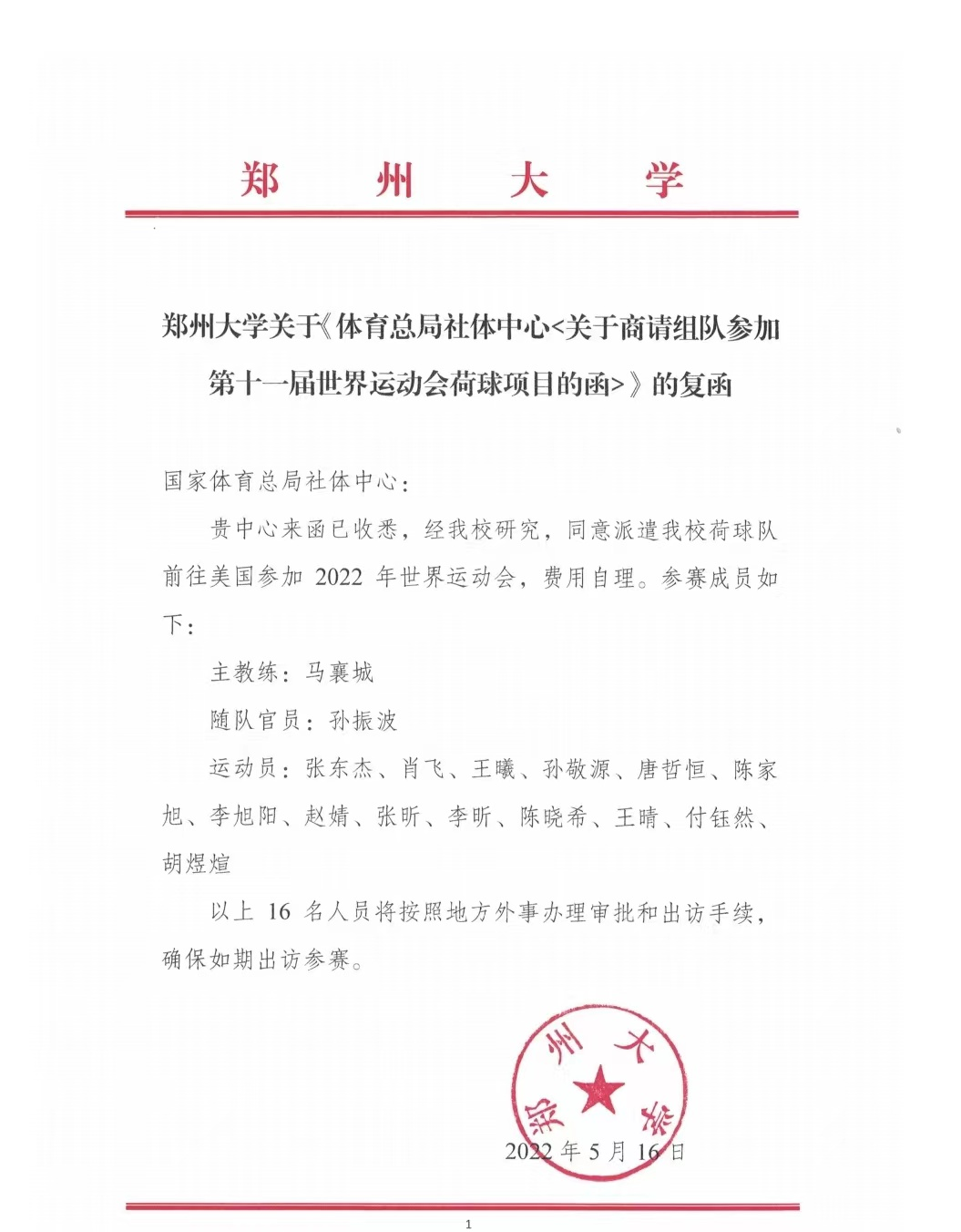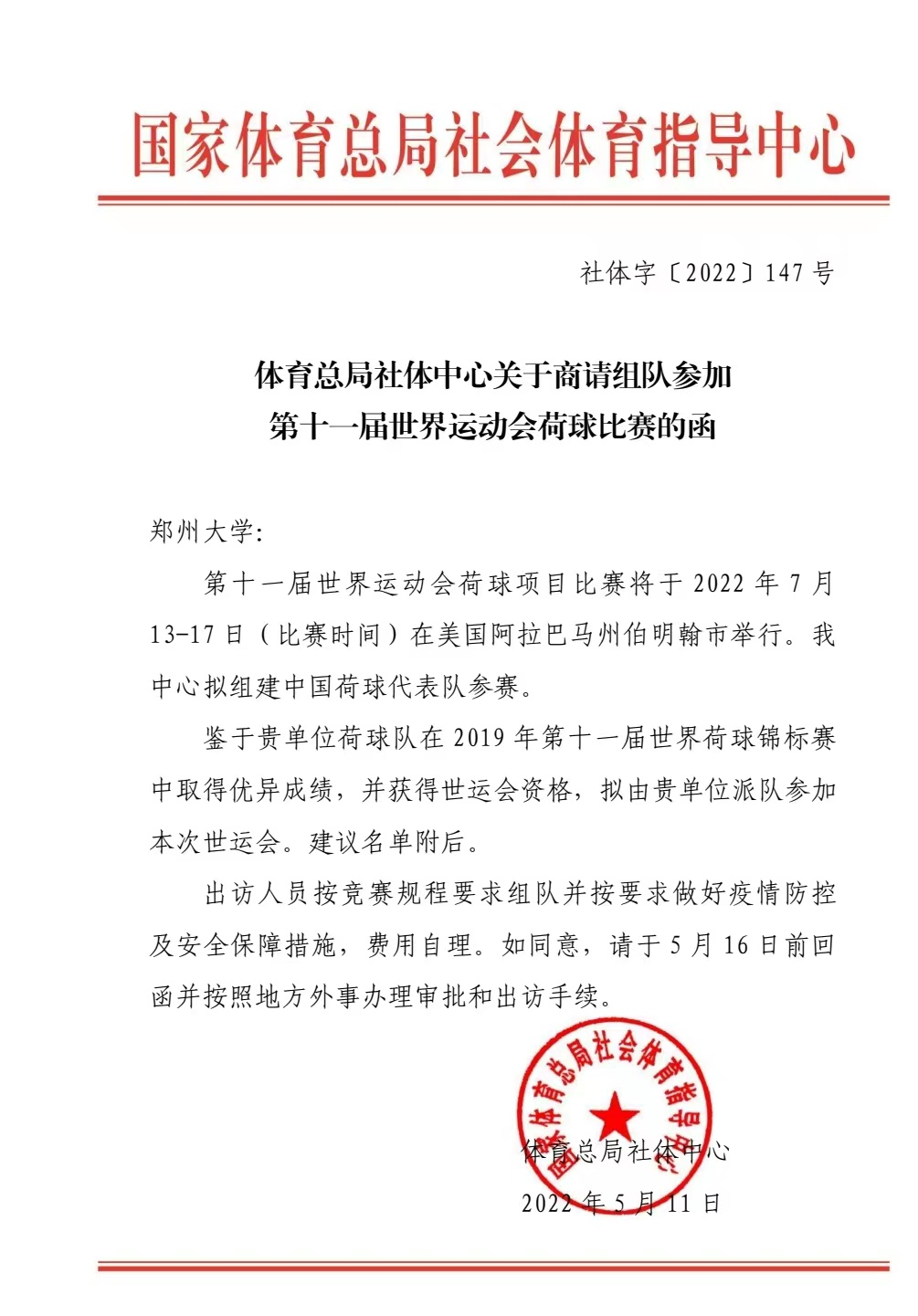 國家體育總局社體指導中心來函商請鄭州大學組隊參加第十一屆世界運動會荷球比賽