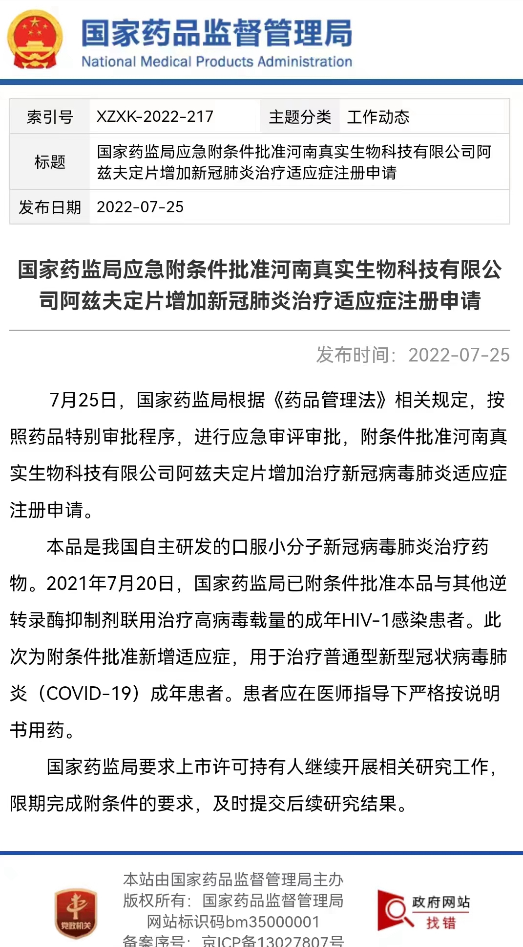 7月25日下午,國家藥監局官網公布信息,根據《藥品管理法》相關規定,按照藥品特別審批程序,進行應急審評審批,附條件批準河南真實生物科技有限公司阿茲夫定片增加治療新冠病毒肺炎適應癥注冊申請。這標志著由鄭州大學常俊標教授作為發明人,河南真實生物科技有限公司研發的我國首個抗新冠肺炎小分子口服藥,在國內外完成Ⅲ期臨床試驗后,正式獲批上市。