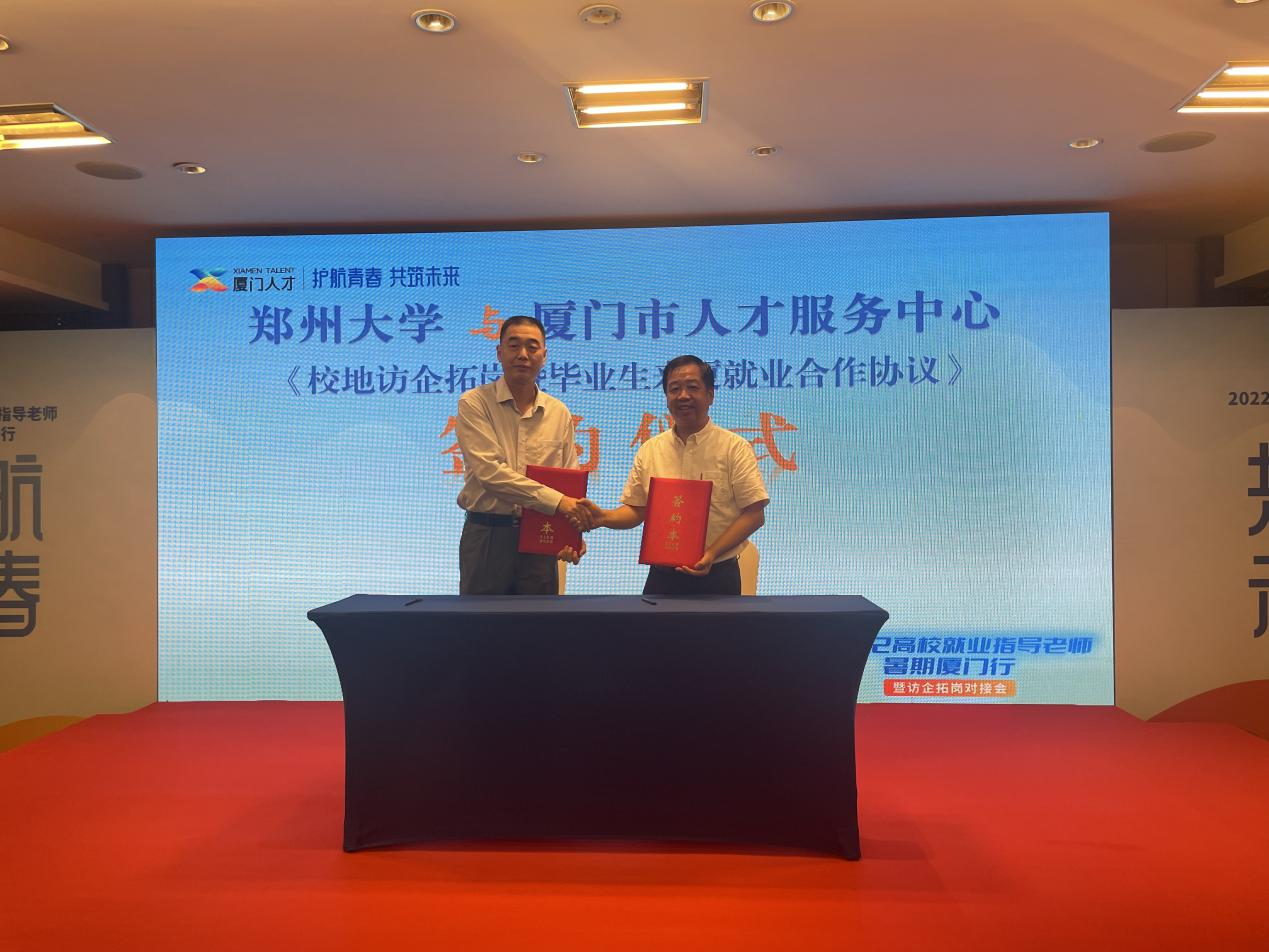 雙方在校地合作、訪企拓崗、人才輸送、招聘對接、政策推介及信息共享等方面達成戰略合作意向。吳宏陽代表鄭州大學與廈門市人才服務中心簽訂了《校地訪企拓崗暨畢業生來廈就業合作協議》。