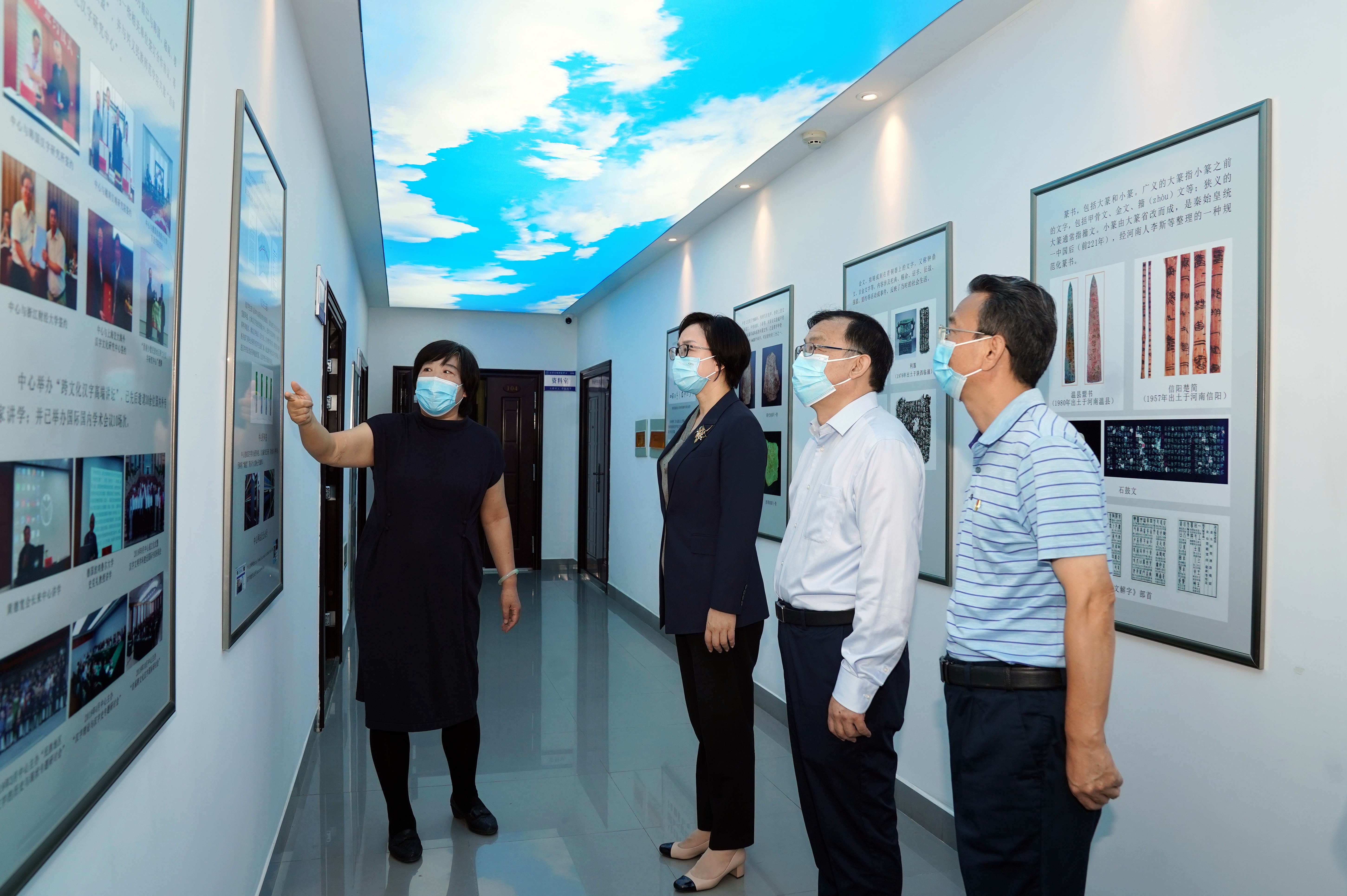在圖書館,李蓬實(shí)地了解文獻(xiàn)信息資源和服務(wù)功能情況,并對(duì)圖書館珍貴古文、古籍的保護(hù)工作給予肯定,同時(shí)指出要進(jìn)一步加強(qiáng)信息化、數(shù)字化建設(shè)。在外國(guó)語(yǔ)與國(guó)際關(guān)系學(xué)院,她詳細(xì)了解學(xué)院發(fā)展歷程和建設(shè)情況,并對(duì)學(xué)院濃厚的文化育人氛圍給予高度評(píng)價(jià)。在歷史學(xué)院,李蓬現(xiàn)場(chǎng)察看了中原歷史文化優(yōu)勢(shì)特色學(xué)科部分成果,參觀了科技考古實(shí)驗(yàn)室,指出要依托中原歷史文化豐富資源,加快鄭州大學(xué)博物館建設(shè),助力學(xué)科發(fā)展。在文學(xué)院,李蓬聽取了漢字文明中心建設(shè)情況介紹,對(duì)中心未來(lái)的發(fā)展提出期望。在新聞與傳播學(xué)院,她重點(diǎn)了解穆青研究中心的建設(shè)情況,并對(duì)學(xué)院傳承“勿忘人民”精神、打造特色育人項(xiàng)目表示肯定。