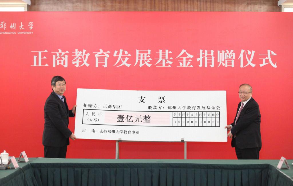 2.2018年2月7日,鄭州大學正商教育發展基金捐贈儀式在主校區舉行。由1979級校友張敬國先生創辦的正商集團向學校捐贈1億元人民幣設立“正商教育發展基金”,助力鄭州大學一流大學建設。