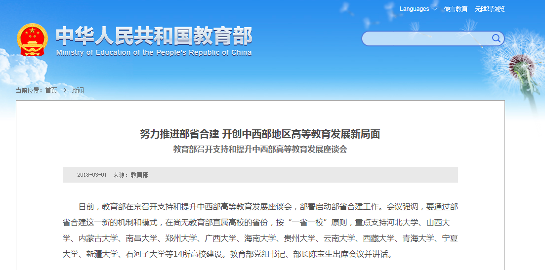 3.2018年2月,教育部在北京召開支持和提升中西部高等教育發展座談會,部署啟動部省合建工作。會議強調,要通過部省合建這一新的機制和模式,在尚無教育部直屬高校的省份,按“一省一校”原則,重點支持學校等14所高校建設。
