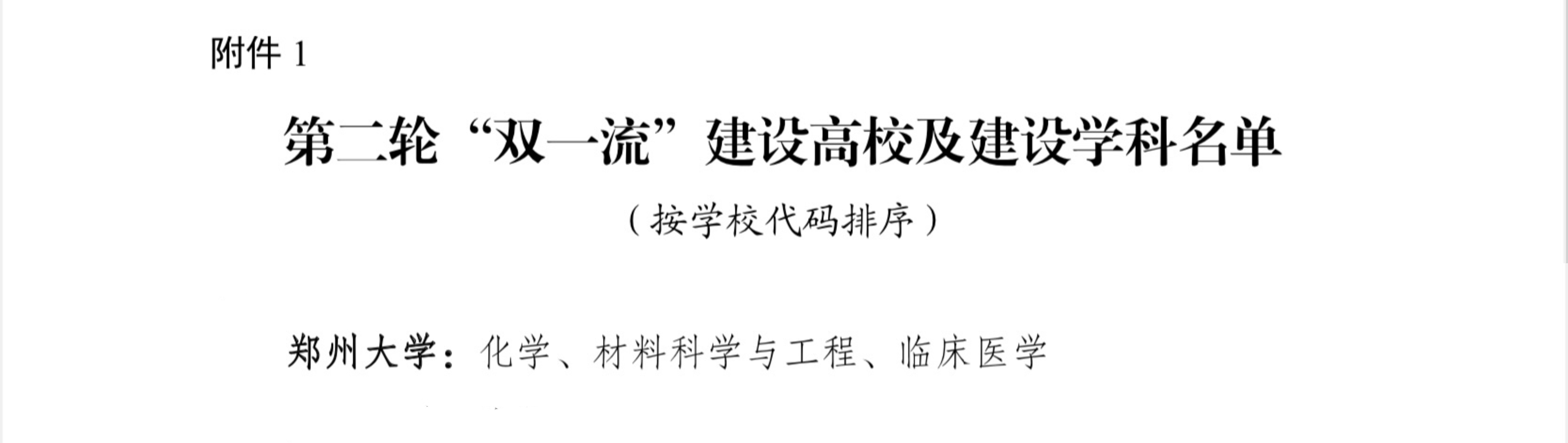 1.2022年2月9日,經國務院同意,教育部、財政部、國家發展改革委印發了《關于公布第二輪“雙一流”建設高校及建設學科名單的通知》,公布了第二輪“雙一流”建設高校及建設學科名單。鄭州大學及學校化學、材料科學與工程、臨床醫學三個學科入選其中。