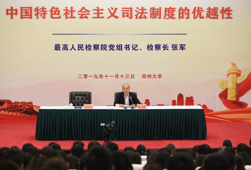 1.11月13日,最高人民檢察院黨組書記、檢察長張軍為鄭州大學師生作《中國特色社會主義司法制度的優越性》專題講座,客觀分析了中國特色社會主義司法制度對國家經濟快速發展和社會長期穩定所作出的巨大貢獻,全面闡釋了中國特色社會主義司法制度的優越性。張軍還觀看了鄭州大學依法治校成果展,對學校依法治校和檢校合作工作給予了高度評價和充分肯定。