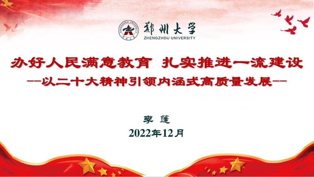 為深入學習宣傳貫徹黨的二十大精神,根據校黨委統一安排部署,12月22日,中國科學院院士、校長李蓬以《辦好人民滿意教育,扎實推進一流建設》為題,向全校師生開展黨的二十大精神專題宣講。各職能部門、學院和科研機構主要負責同志,中青年骨干教師及學生代表,鄭州大學學習貫徹黨的二十大精神宣講團成員,巾幗勞模宣講團成員,團學骨干宣講團成員,骨干思政課教師宣講團成員等2000余人以線上直播形式參加宣講會。會議由校黨委副書記吳宏陽主持。