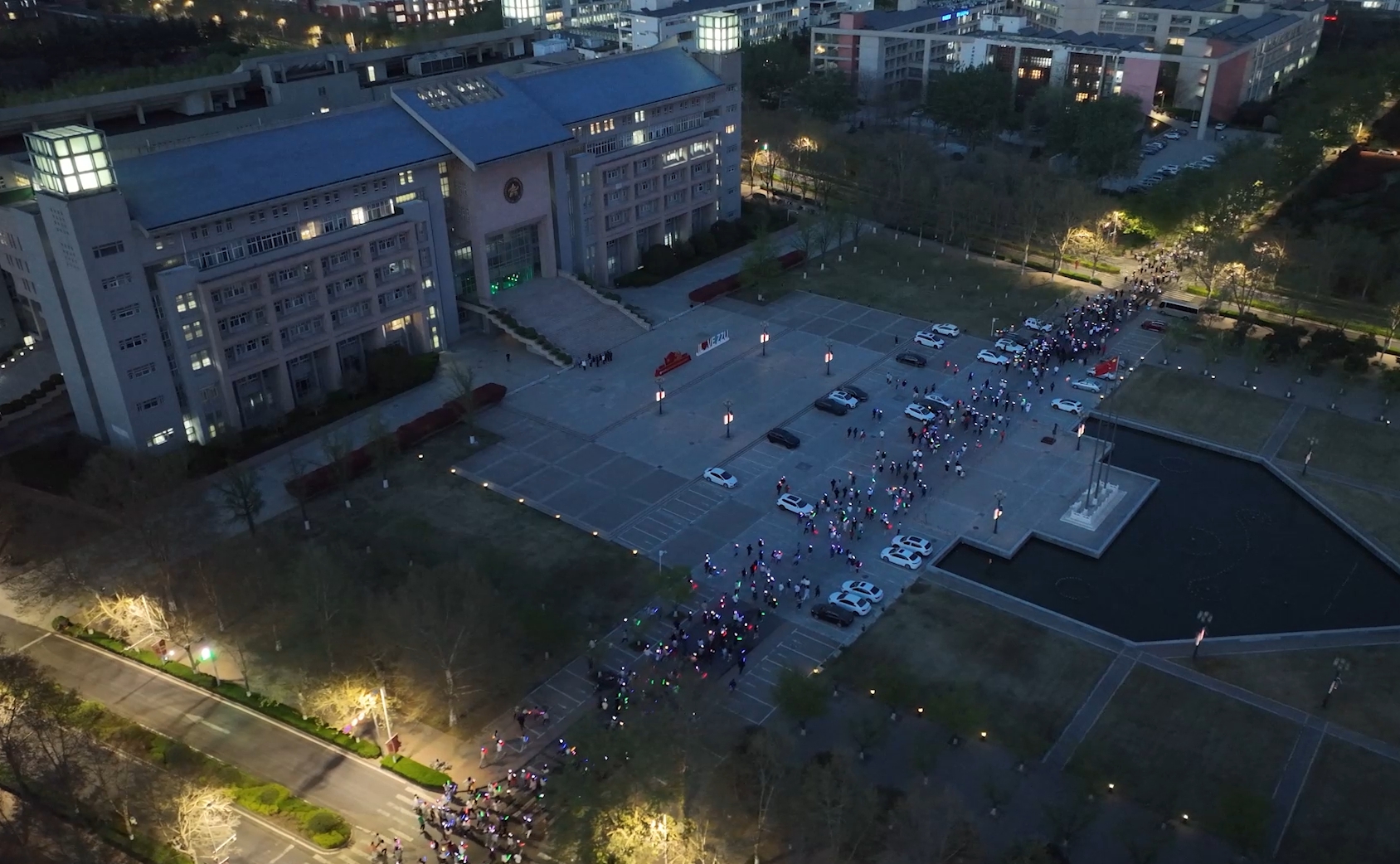 本次夜跑活動由“共筑一個夢”簽到打卡、“共繪一幅畫”航拍、“共赴一條路”熒光夜跑和“共覽一場景”熒光燈會四部分組成,全程3.5公里。活動開始前,同學們齊聚南操場打卡簽名,并用他們佩戴的熒光頭飾、熒光棒、手環等組成“ZZU”和“RUN”的字樣。19時,在緊張而熱烈的氣氛中,吳宏陽按動發令槍,夜跑準時開始,同學們揮動各色熒光棒出發,匯成一條耀眼的星河。在夜跑結束后的熒光燈會上,吳宏陽和參與活動的師生們一同猜燈謎,重溫黨史知識。