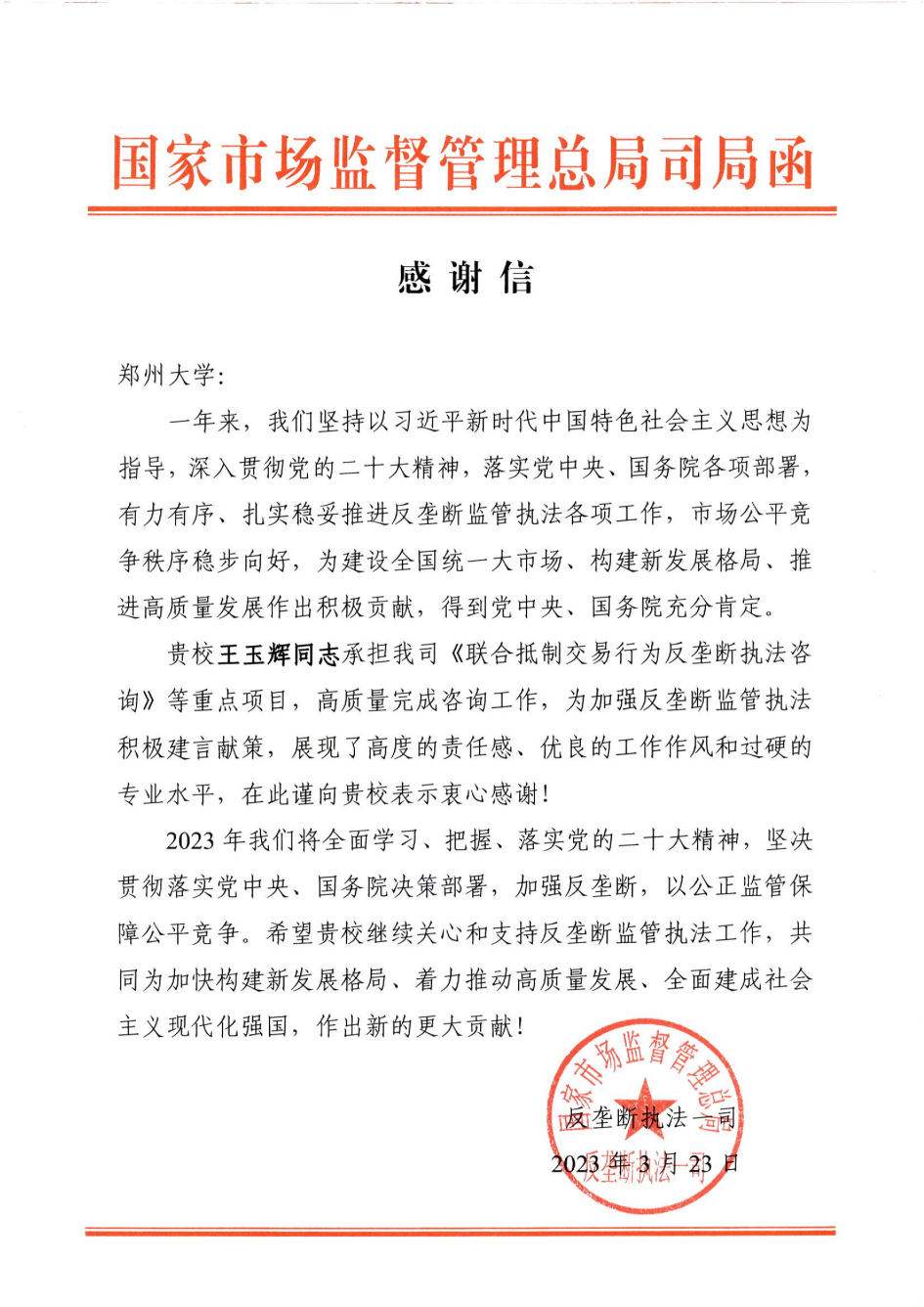 近日,國家市場監管總局反壟斷執法一司向鄭州大學發來感謝信。感謝鄭州大學法學院王玉輝教授在推進我國壟斷協議執法規則體系構建中作出的積極貢獻。