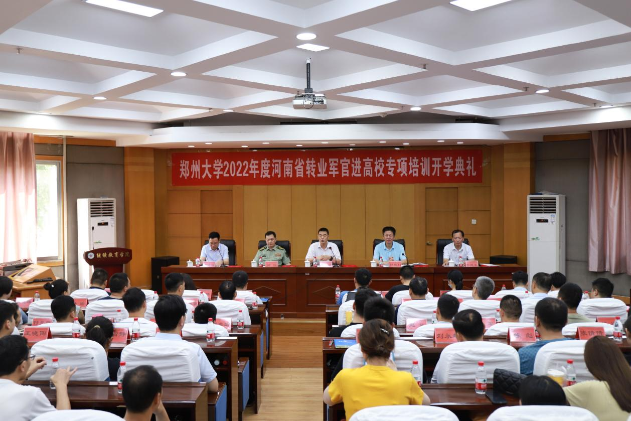 7月11日上午,鄭州大學(xué)舉辦2022年度河南省轉(zhuǎn)業(yè)軍官進(jìn)高校專項培訓(xùn)開學(xué)典禮。省退役軍人事務(wù)廳二級巡視員郭勝利,學(xué)校黨委副書記吳宏陽,省軍區(qū)轉(zhuǎn)業(yè)辦主任徐明,省退役軍人事務(wù)廳軍轉(zhuǎn)干部移交安置處處長李德東出席,專項培訓(xùn)領(lǐng)導(dǎo)小組成員,鄭州大學(xué)軍轉(zhuǎn)干部學(xué)院主要負(fù)責(zé)同志,實訓(xùn)導(dǎo)師代表及全體參訓(xùn)學(xué)員參加了典禮。典禮由學(xué)校干部培訓(xùn)中心負(fù)責(zé)同志主持。
