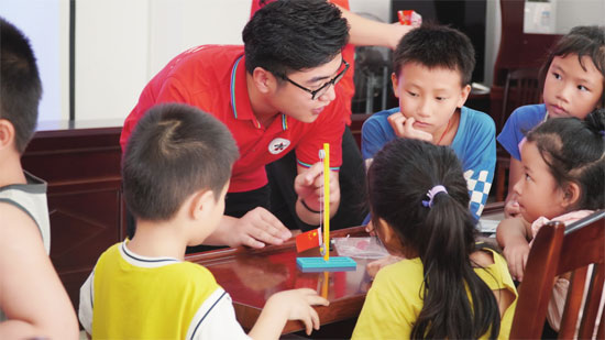 研支團志愿者趙宇在安置點陪孩子們做實驗。
