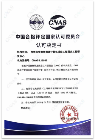 日前,鄭州大學(xué)橡塑模具計算機輔助工程國家工程研究中心通過了CNAS批準發(fā)布的“實驗室認可證書”(注冊號:CNAS L19983)。這表明我校已經(jīng)完全具備按照有關(guān)國際認可準則開展檢測服務(wù)的能力,可以出具被國家甚至國際認可的、具有相應(yīng)法律效力的檢測報告,為檢測結(jié)果的準確性提供了佐證,并被列入《國家認可實驗室名錄》。此次通過CNAS認證,既是對實驗室管理和檢測能力等方面取得成績的充分肯定,也進一步提升了我校在行業(yè)的影響力,拓寬了我校相關(guān)學(xué)科參與產(chǎn)學(xué)研合作、國際間實驗室合作的發(fā)展通道。