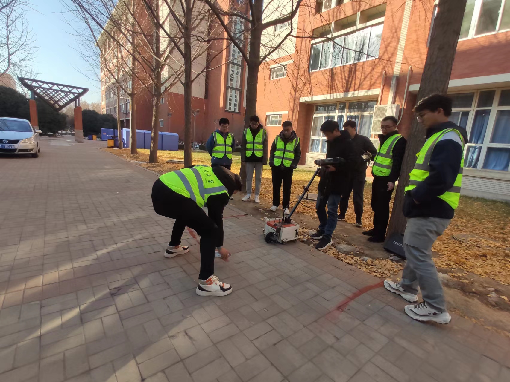 此次安全隱患排查由基建處統籌安排,保衛處、后勤保障中心、主校區、南校園、北校園、東校園綜合管理部門積極配合。水利與交通學院方宏遠教授擔任“雙帶頭人”的基礎設施防災減災研究生黨支部志愿義務承擔此次道路隱患探測任務。自2023年12月底至今,工作人員放棄寒假,深入各校區校園和教職工住宅區,重點對主干道、廣場、建筑物周邊道路等開展一次拉網式隱患排查探測。經過近兩個月的工期,共檢查路面67.55km,順利完成校園和教職工住宅區道路隱患排查。基建處根據排查結果及時梳理隱患點并形成臺賬,各相關部門根據任務分工對排查出的道路病害分別進行整治,加強日常巡視管理。