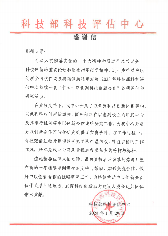 近日,鄭州大學收到科技部科技評估中心的感謝信,感謝我校張倩紅教授以色列研究團隊為科技部科技評估中心“中國—以色列科技創新合作”項目所給予的咨詢和支持,希望未來與我校繼續做好中以創新合作的戰略研究,推動中以創新全面伙伴關系行穩致遠。