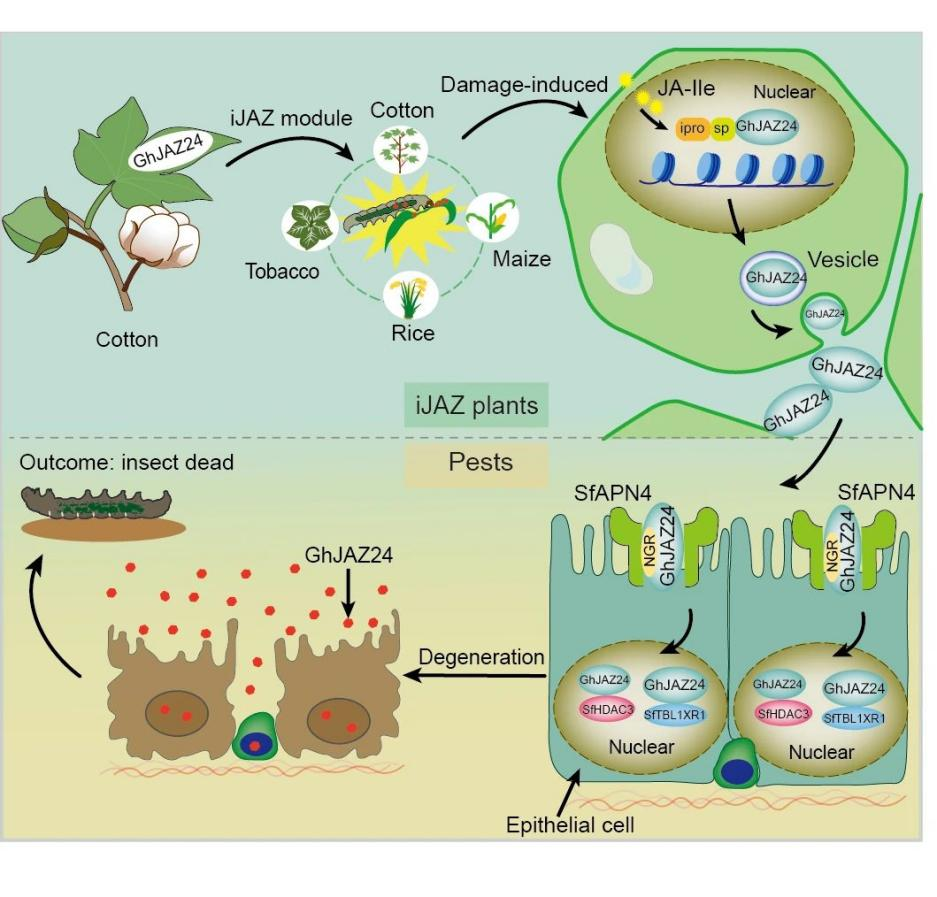 草地貪夜蛾、棉鈴蟲、玉米螟、稻縱卷葉螟等鱗翅目害蟲會對玉米、棉花、水稻、蔬菜等農作物造成重大破壞,部分害蟲對目前廣泛應用的蘇云金芽孢桿菌Bt蛋白及一些化學農藥產生了抗性,亟需新型殺蟲蛋白來進行防控。針對上述難題,李付廣研究員團隊經過多年的研究發現了棉花源新型殺蟲蛋白GhJAZ24。GhJAZ24蛋白的殺蟲機制與蘇云金芽孢桿菌Bt蛋白的殺蟲機制完全不同,可在生產上替代過表達Bt蛋白的抗蟲農作物,未來可在林草、果蔬等植物的鱗翅目害蟲防控方面發揮重要作用。同時,可通過GhJAZ24蛋白進一步研制高效穩定的殺蟲多肽,殺蟲多肽作為綠色生物農藥,在防控草地貪夜蛾、棉鈴蟲、玉米螟、稻縱卷葉螟等鱗翅目害蟲方面發揮重要作用。