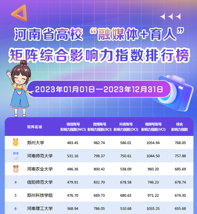 近日,省教育廳發(fā)布《河南省高校網(wǎng)絡(luò)思政工作(矩陣建設(shè))2023年度新媒體白皮書》(以下簡稱“白皮書”),對全省高校思政融媒體矩陣微信公眾號、微博、短視頻等新媒體平臺的傳播力進行梳理與分析。鄭州大學“融媒體+育人”矩陣(包括官方新媒體、黨委學工部、團委、馬克思主義學院、心理健康教育中心)綜合影響力指數(shù)最高,達到768.05,位居榜單第一。此外,鄭州大學團委官方微信號“鄭州大學青年集結(jié)號”位居全省高校團委微信公眾號影響力排行榜第一名。